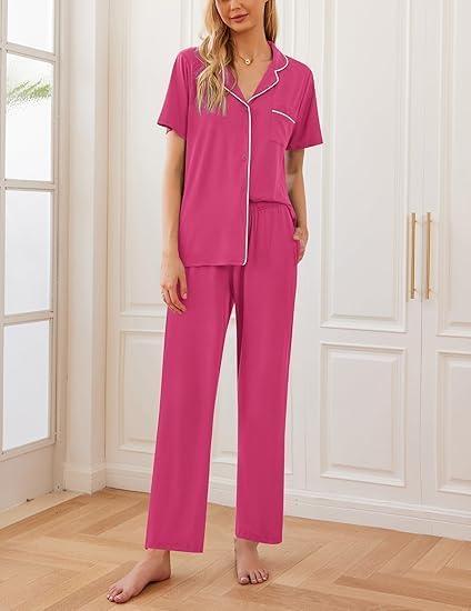 Ekouaer 2 Pack:Womens Pajamas Short Sleeve Pjs Notch Collar Button Up Loungewear Cozy Sleepwear Sets(Black_hot Pink)