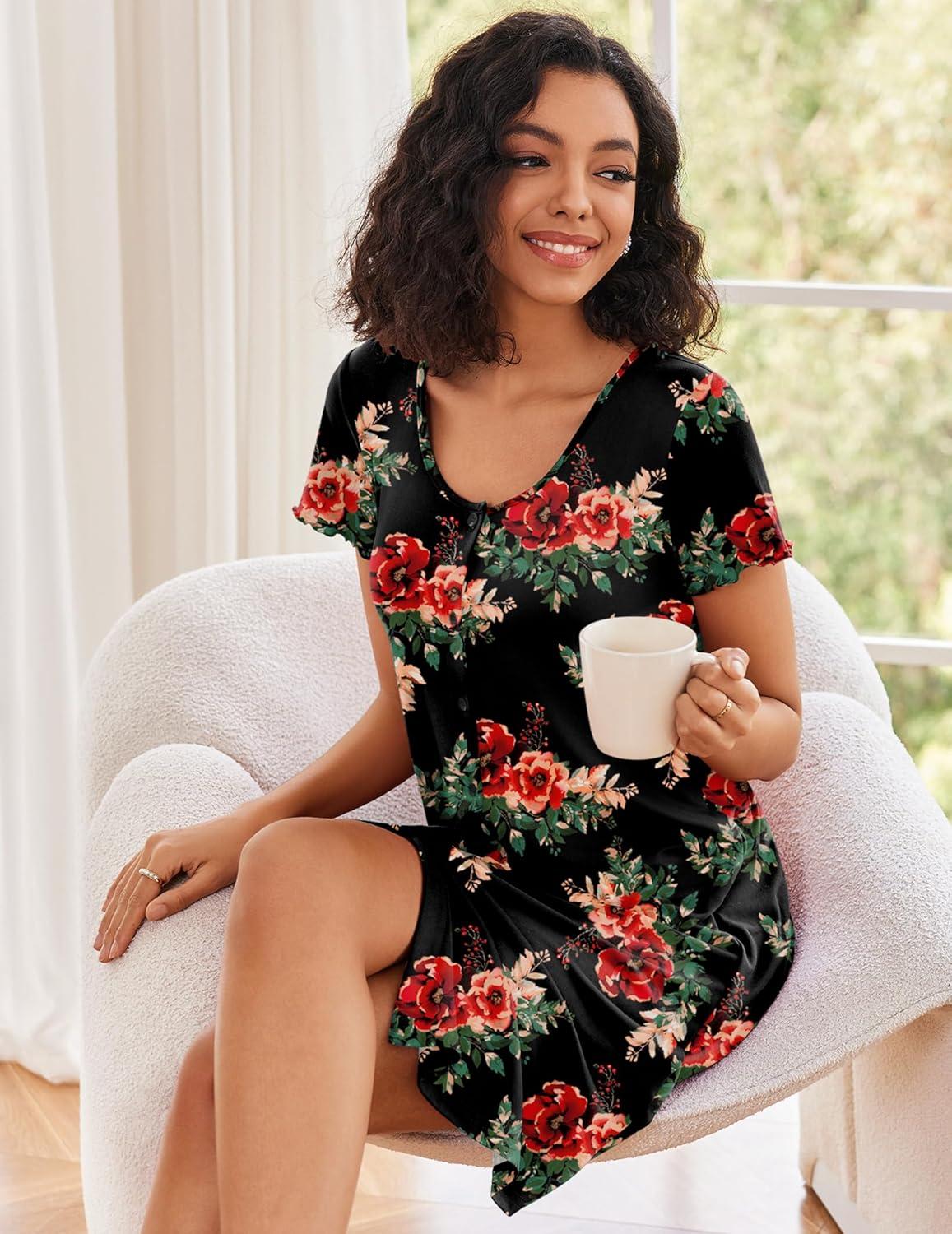 Ekouaer 2 Pack Nightgowns for Women Button Down Night Shirts Short Sleeve Sleep Shirts V Neck Sleepwear Pajama Dress(Black Flower navy)
