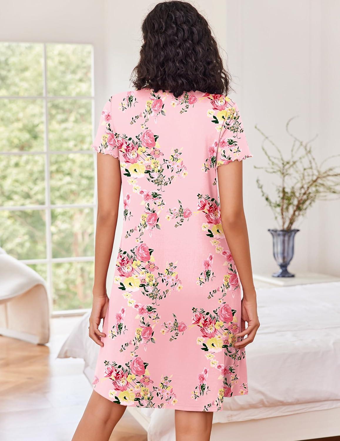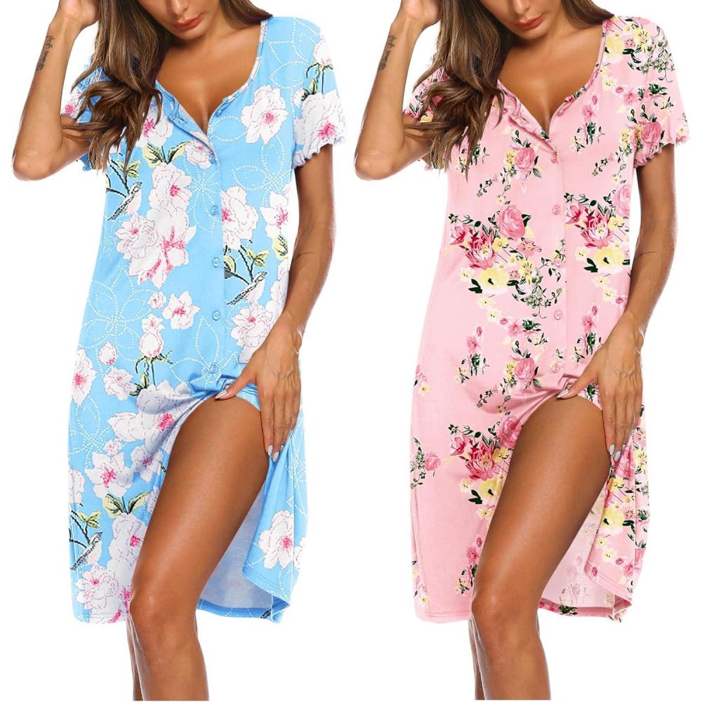 Ekouaer 2 Pack Nightgowns for Women Button Down Night Shirts Short Sleeve Sleep Shirts V Neck Sleepwear Pajama Dress(Blue Flowers Pink Flowers)