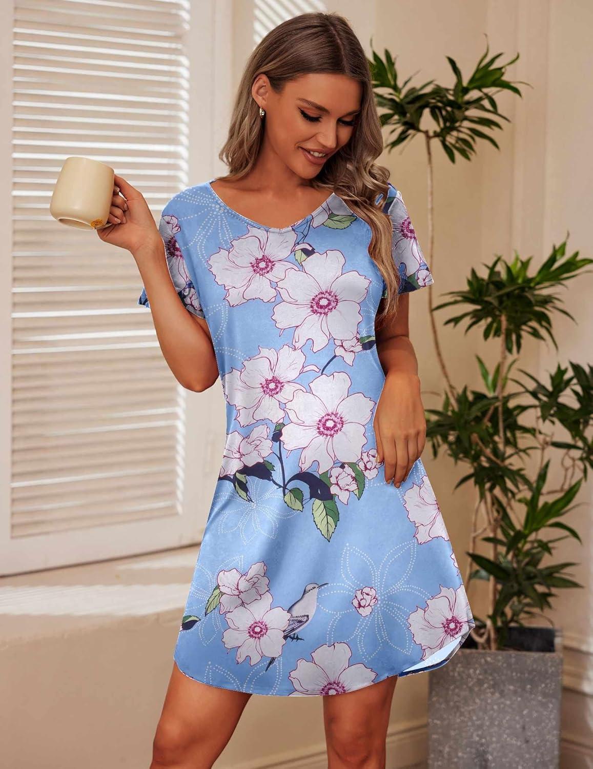 Ekouaer 2 Pack Nightgowns for Women Flare Short Sleeve Sleepshirt V Neck Sleepwear Pajama Dress S-2XL(Blue+white Floral Print)