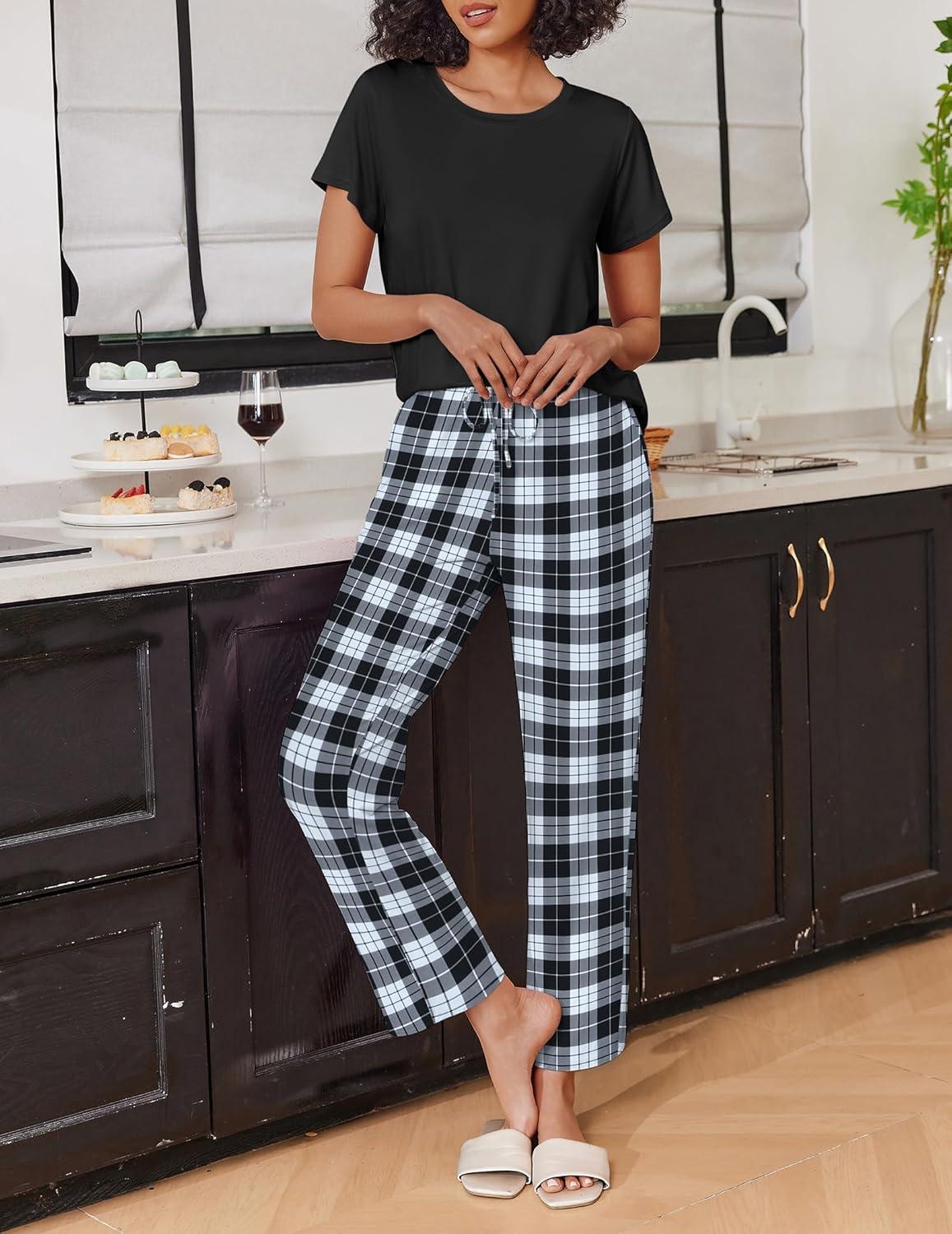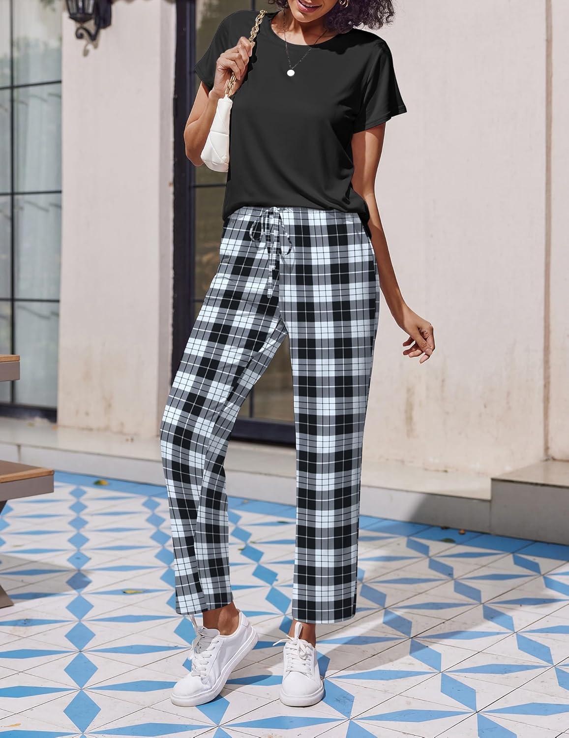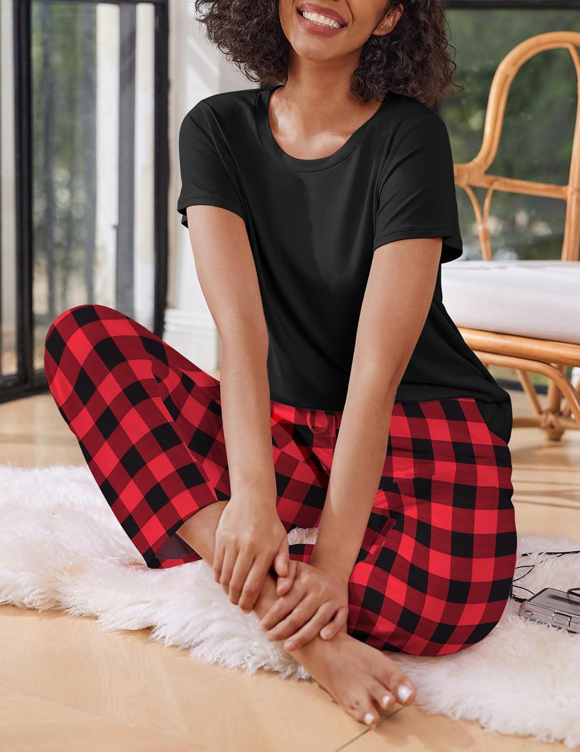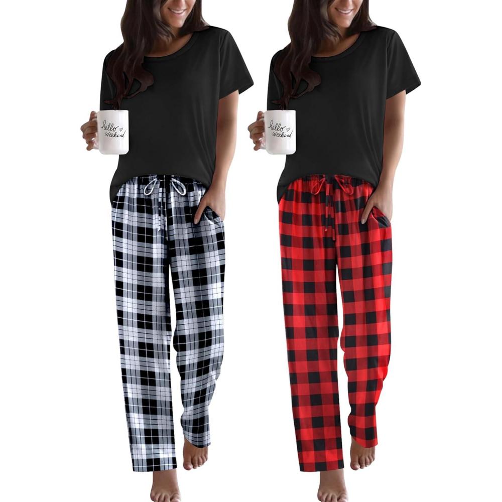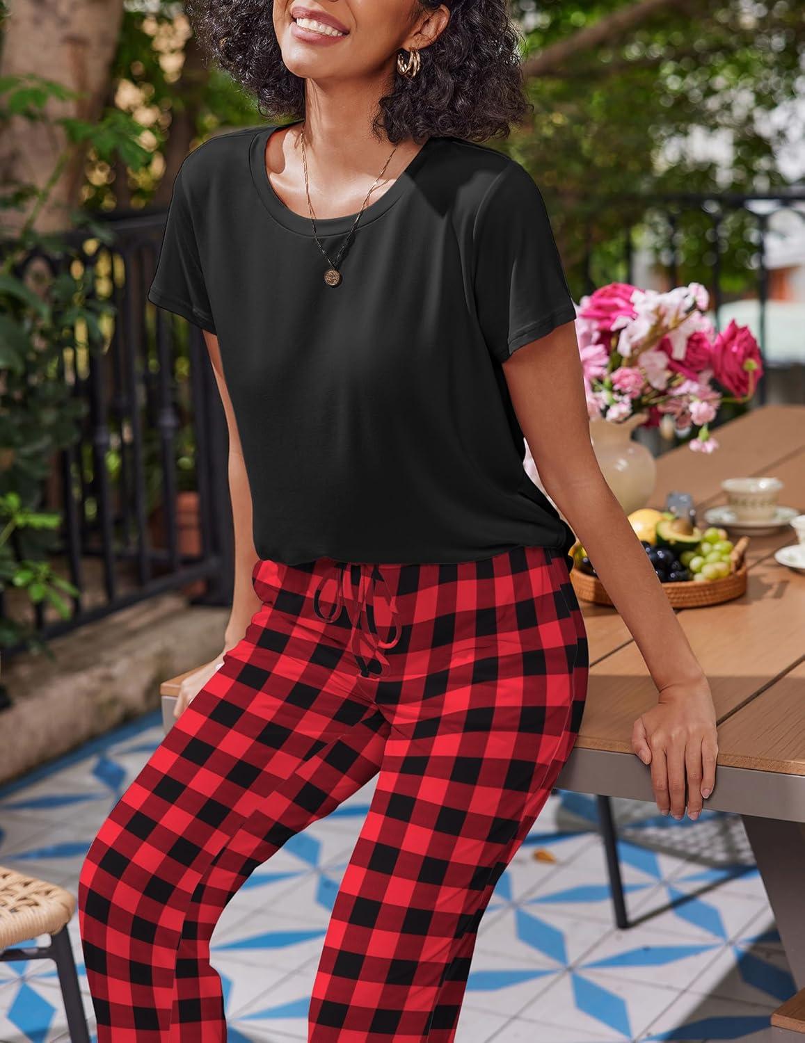 Ekouaer 2 Pack Pajamas for Women Set Short Sleeve Sleepwear Top and Pants Pjs Soft Printed Lounge Sets with Pockets(Black Red Plaid/Black White Plaid)