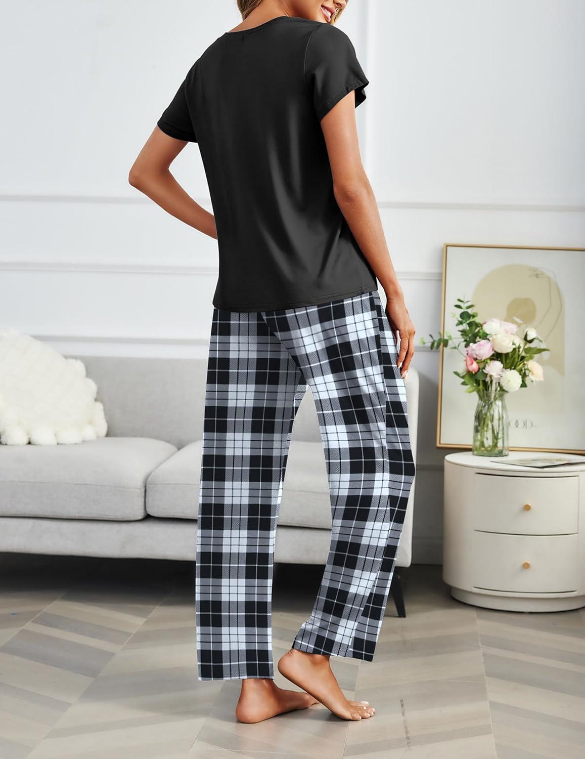 imageEkouaer 2 Pack Pajamas for Women Set Short Sleeve Sleepwear Top and Pants Pjs Soft Printed Lounge Sets with PocketsBlack Red PlaidBlack White Plaid