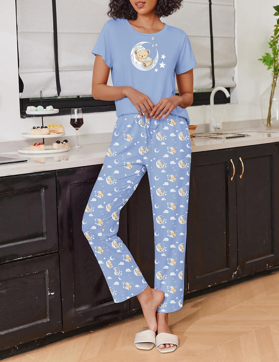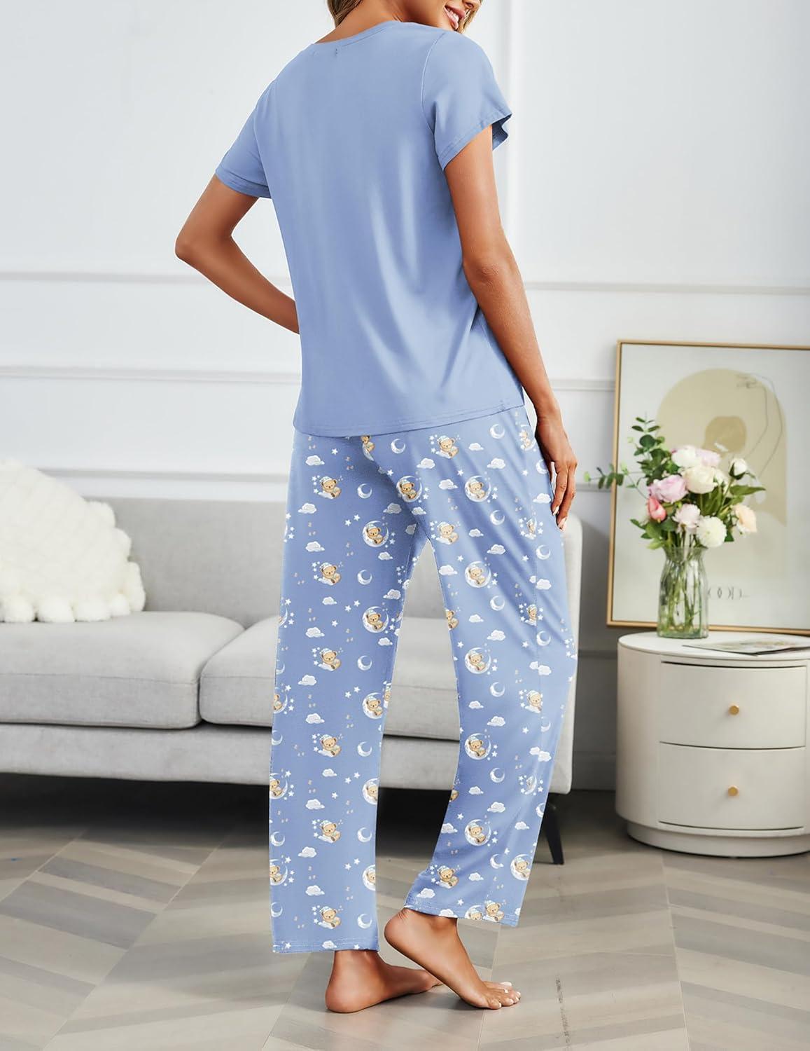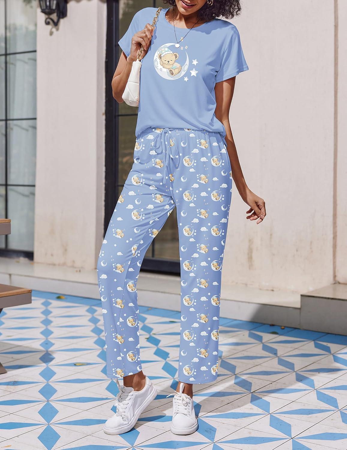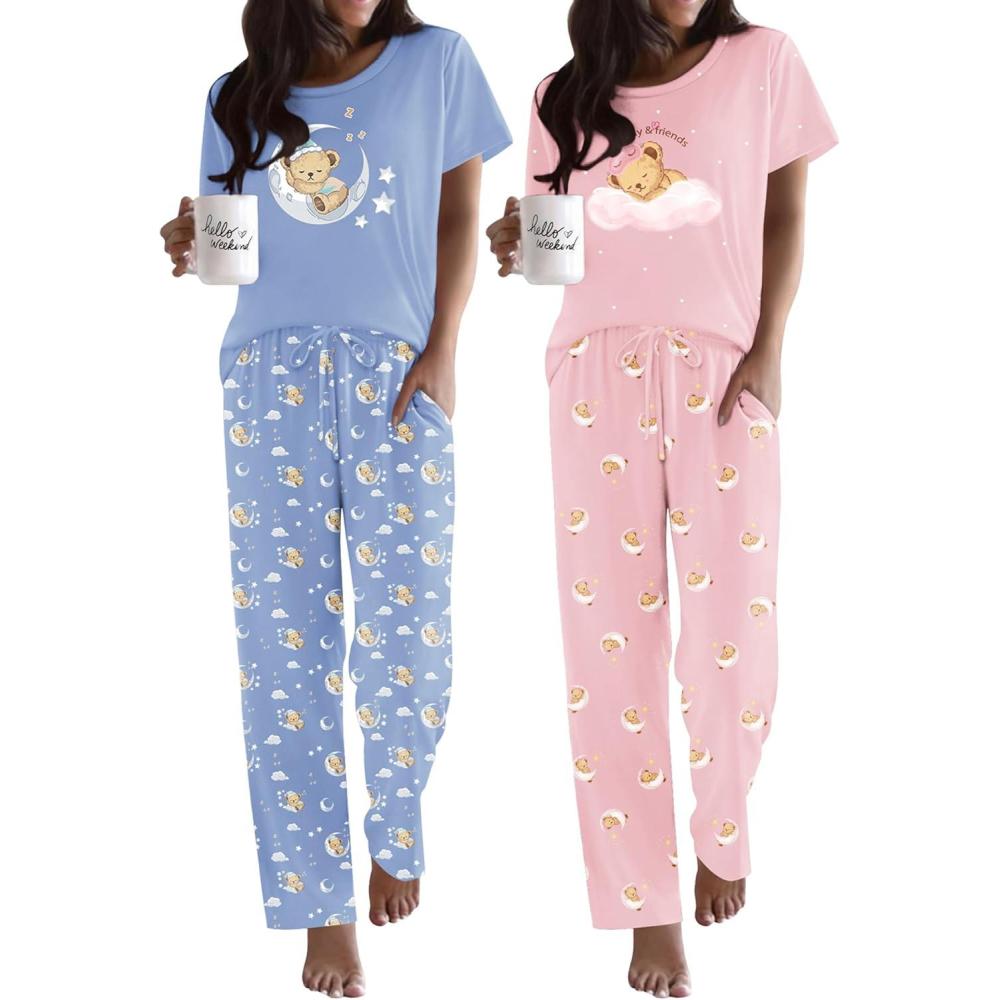 Ekouaer 2 Pack Pajamas for Women Set Short Sleeve Sleepwear Top and Pants Pjs Soft Printed Lounge Sets with Pockets(Blue Teddy/Pink Teddy)
