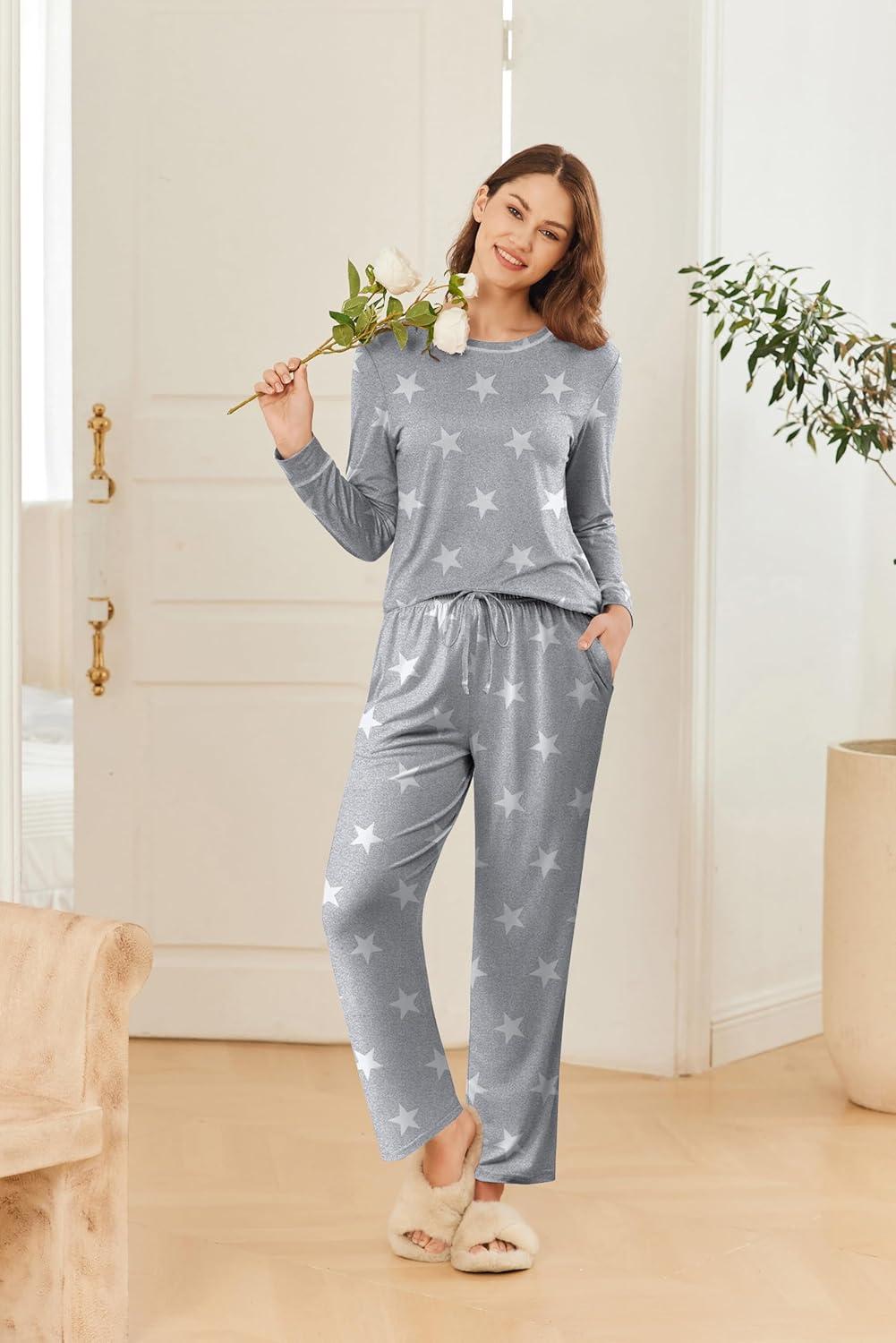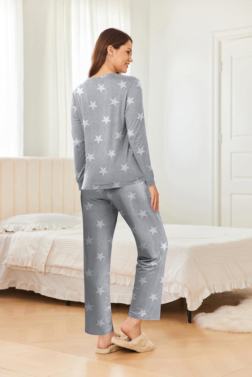 Ekouaer 2 Pack Women Pajama Long Sleeve Sleepwear Soft Loungewear Pjs Sets with Pockets S-XXL(Black/Grey Star Print)