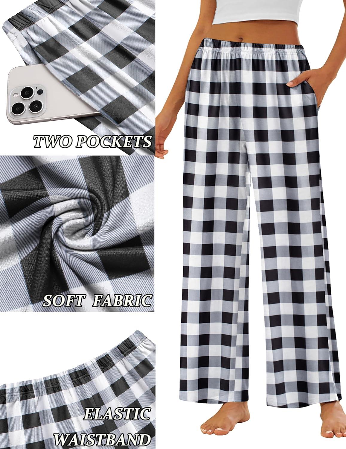 Ekouaer 2 Pack Women Pajama Pants Soft Casual Pajama Bottoms Comfy Wide Leg Sleep Pants Pj Bottoms with Pockets(Black+black White Plaid)