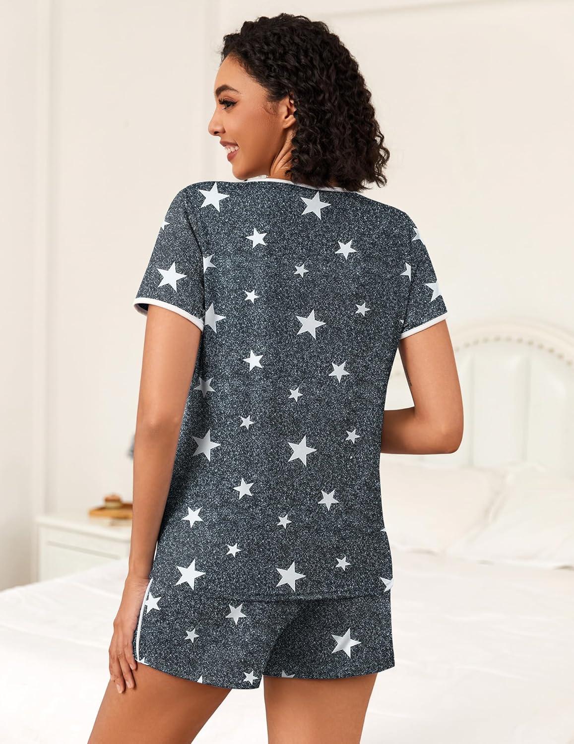 Ekouaer 2 Pack Womens Pajama Sets Short Sleeve Top with Shorts Soft Pj Comfy Sleepwear, Chest Pocket(Black/Light Gary Stars)