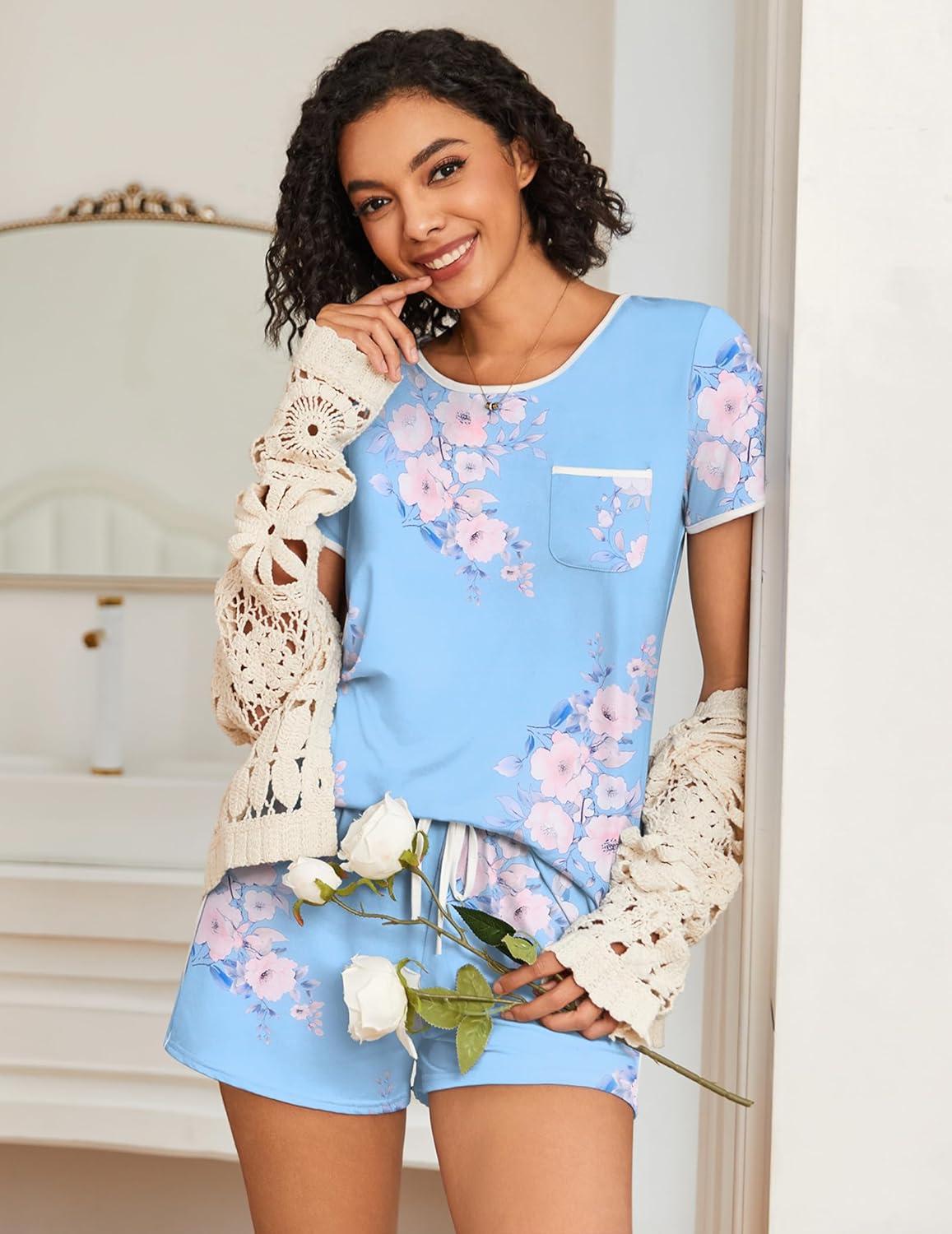 Ekouaer 2 Pack Womens Pajama Sets Short Sleeve Top with Shorts Soft Pj Comfy Sleepwear, Chest Pocket(Blue Flower/Light Blue Flower)