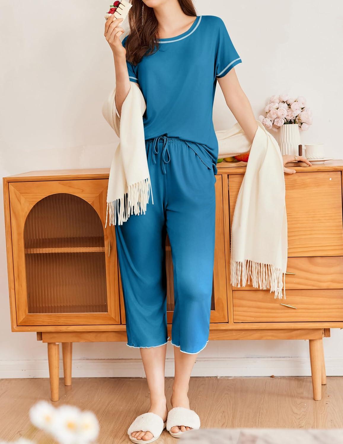 Ekouaer 2 Pack Womens Pajamas Sets Short Sleeve Tops and Capri Pants Pjs Colorful Printed Sleepwear Sets(Blue Flowers Black Flowers)