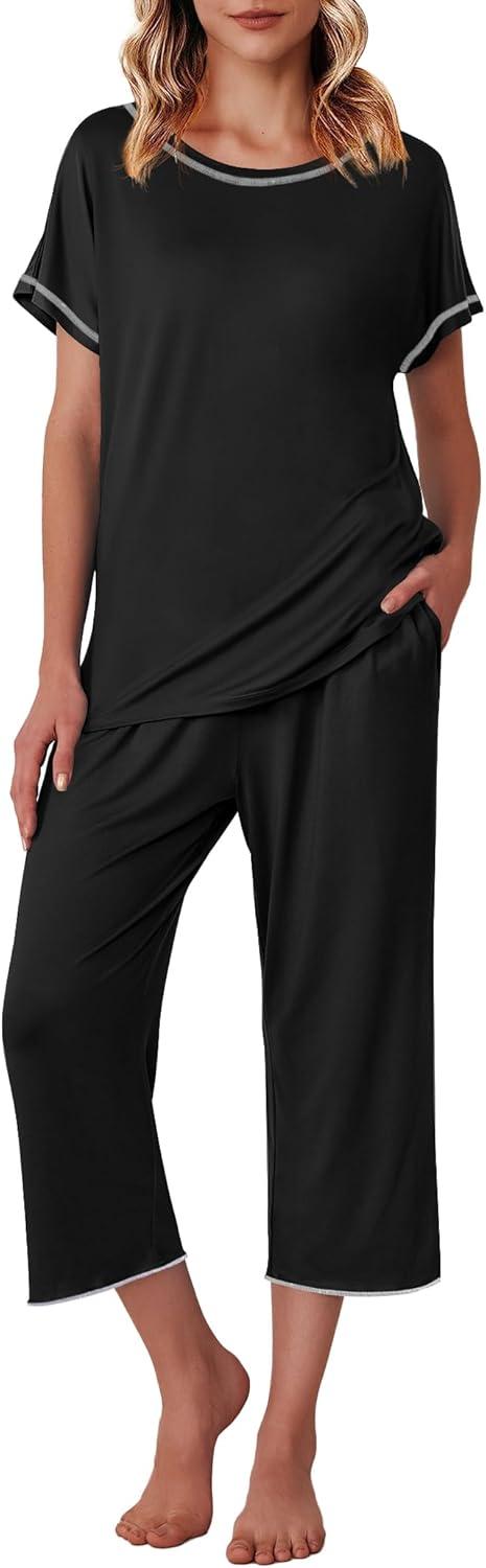 Ekouaer 2 Pack Womens Pajamas Sets Short Sleeve Tops and Capri Pants Pjs Colorful Printed Sleepwear Sets(Black Stripe,leopard)