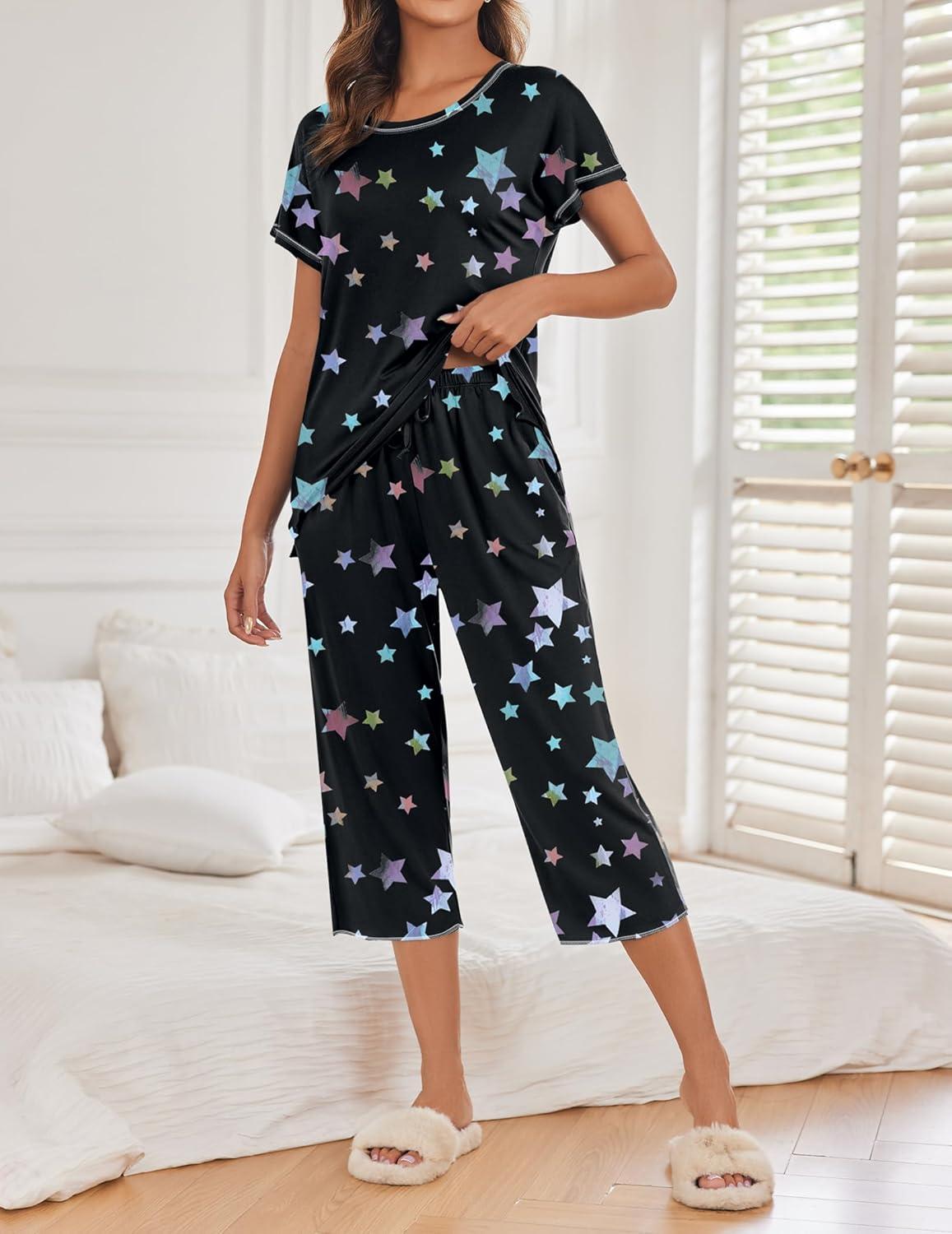 Ekouaer 2 Pack Womens Pajamas Sets Short Sleeve Tops and Capri Pants Pjs Colorful Printed Sleepwear Sets(Stars Love)