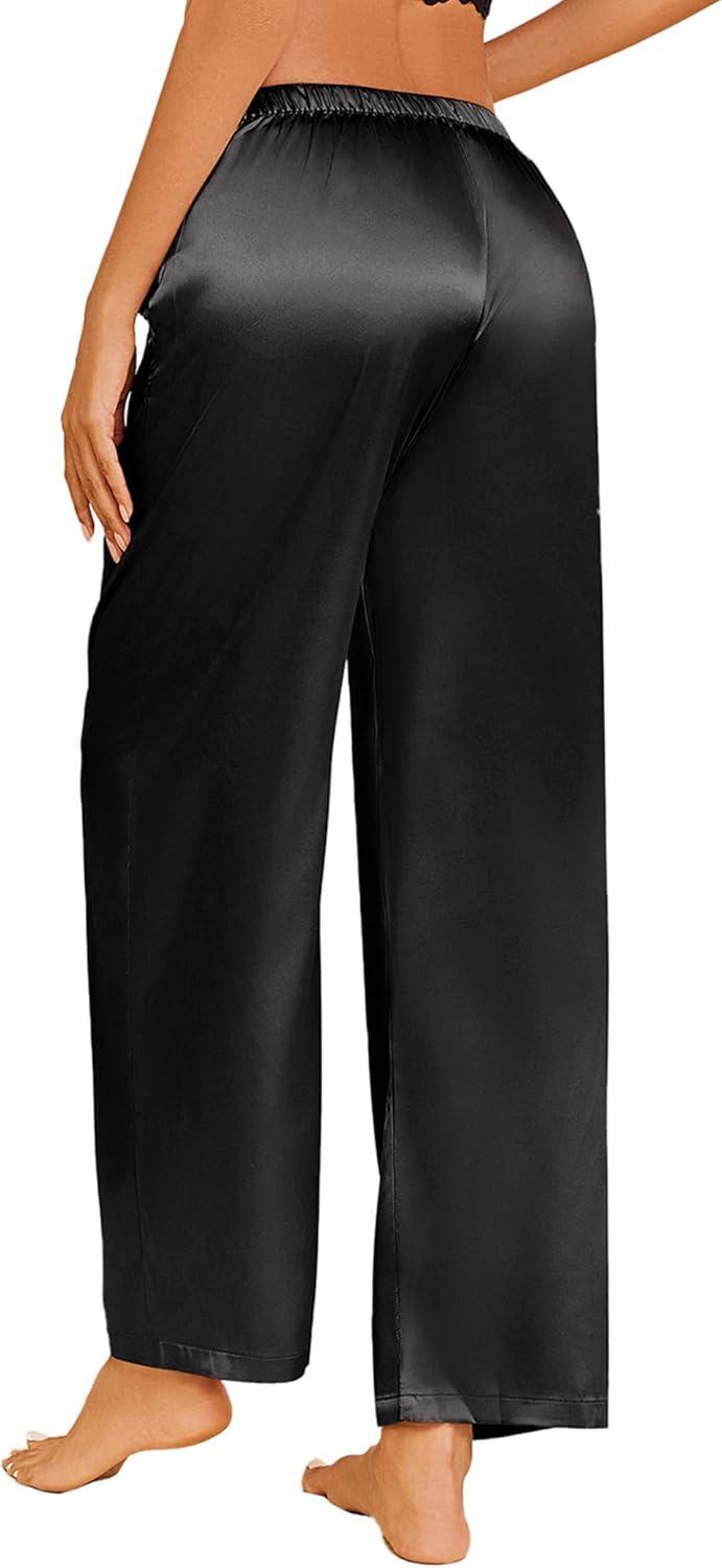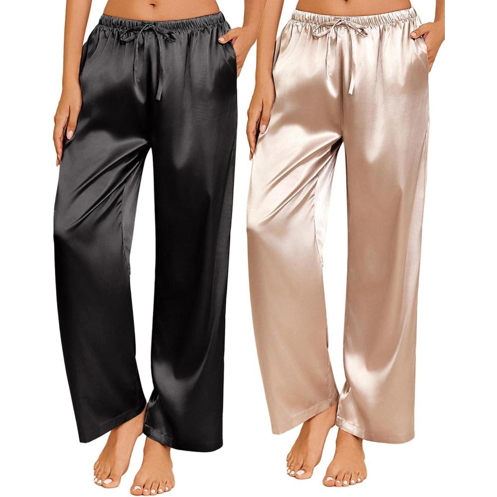 Ekouaer 2 Pack Womens Satin Pajama Pants Silk Sleep Lounge Pants Loose Pj Bottom with Pockets(Black and Champagne)