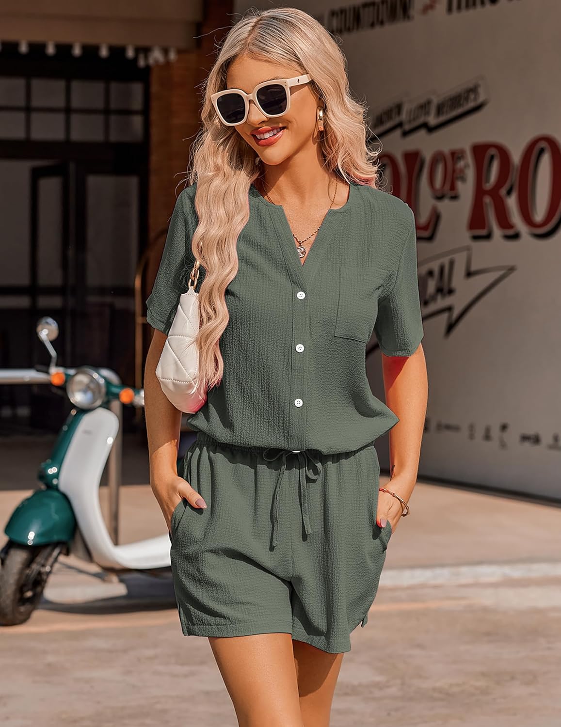 Ekouaer 2 Piece Set for Women Short Sleeve V Neck Vacation Outfits 2024 Casual Loungewear with Pockets for Summer S-XXL(Army Green)