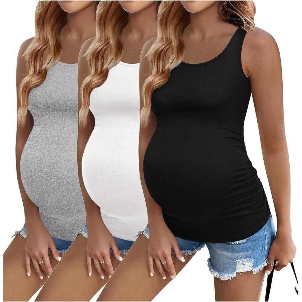 Ekouaer 3 Pack Women Maternity Tank Tops Ruch Side Basic Shirts Summer Postpartum Tops Sleeveless Pregnancy Workout Clothes(Black/Light Grey/White)