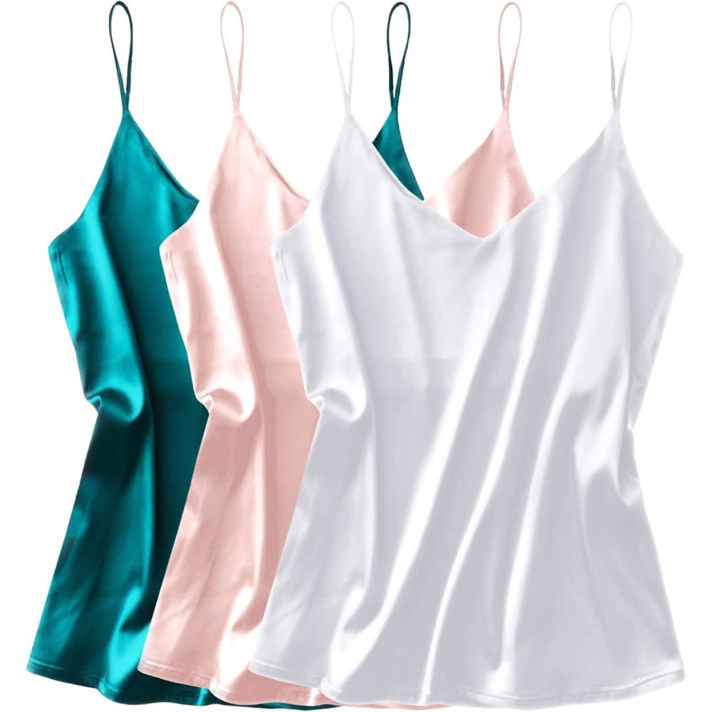 Ekouaer 3 Pack: Womens Silk Satin Tank Top V Neck Camisole Cami Spaghetti Strap Top Loose Sleeveless Blouses Tank Shirt(White/Pink/Dark Green)
