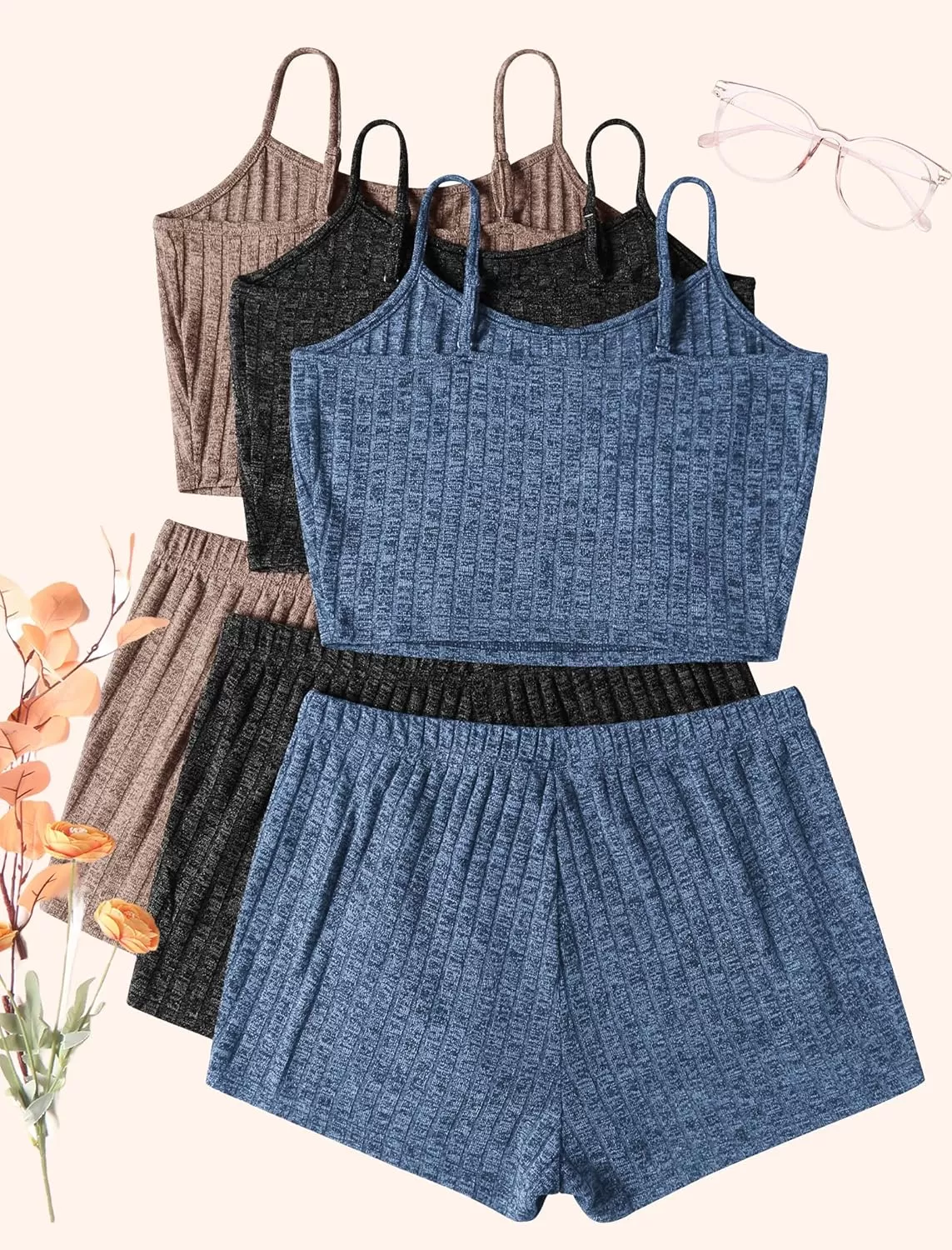 Ekouaer 3 Sets for Women Ribbed Pajamas Crop Cami Top and Shorts Pjs Casual Sleeveless Button Lounge Set Sleepwear(Khaki/Black/Plain Blue)