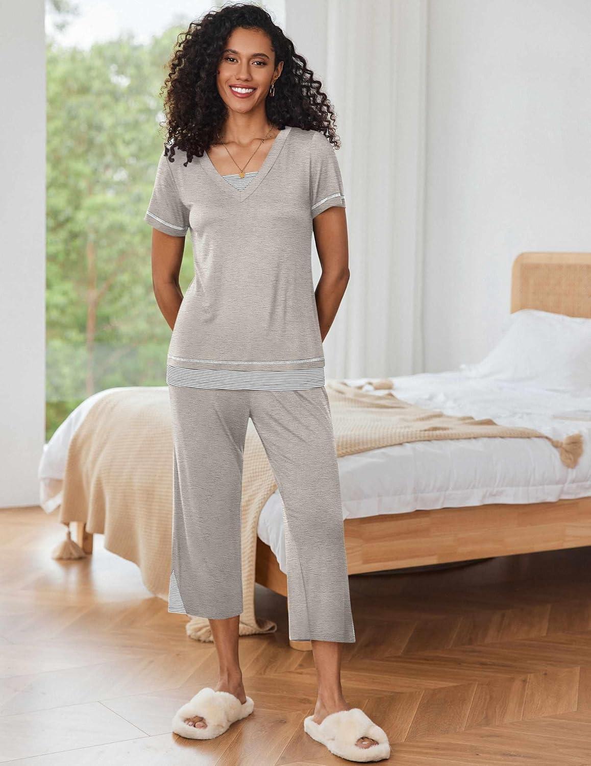 Ekouaer Capri Pajama Sets for Women Short Sleeve Tops Sleepwear Sleep Sets Pjs Sets Soft Two Piece Loungewear Sets(Grey)