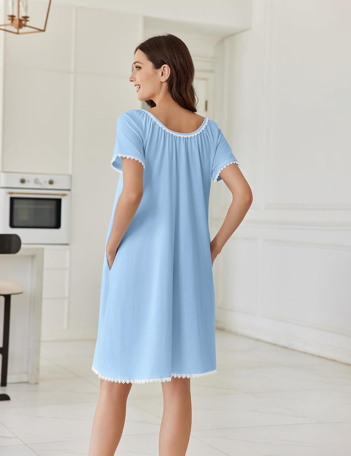 Ekouaer Cotton Nightgowns for Women Lace Trim Sleep Shirts Short Sleeve Night Shirts Sleep Dress with Pockets(Light Blue)