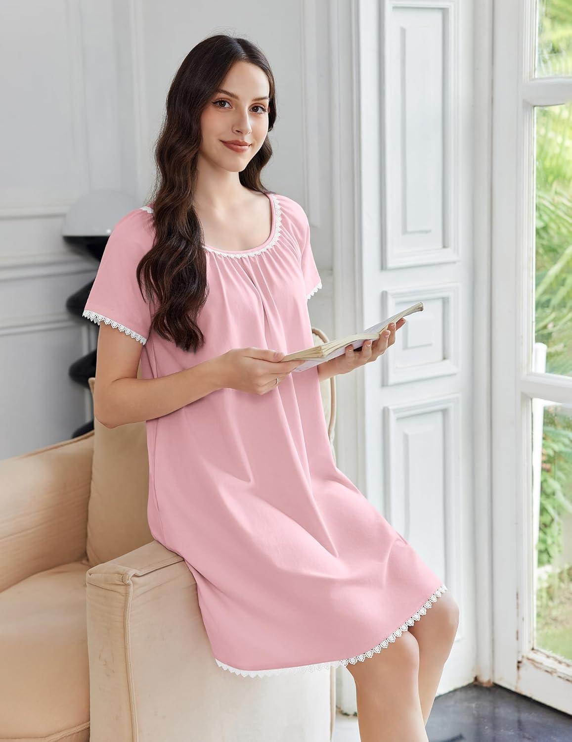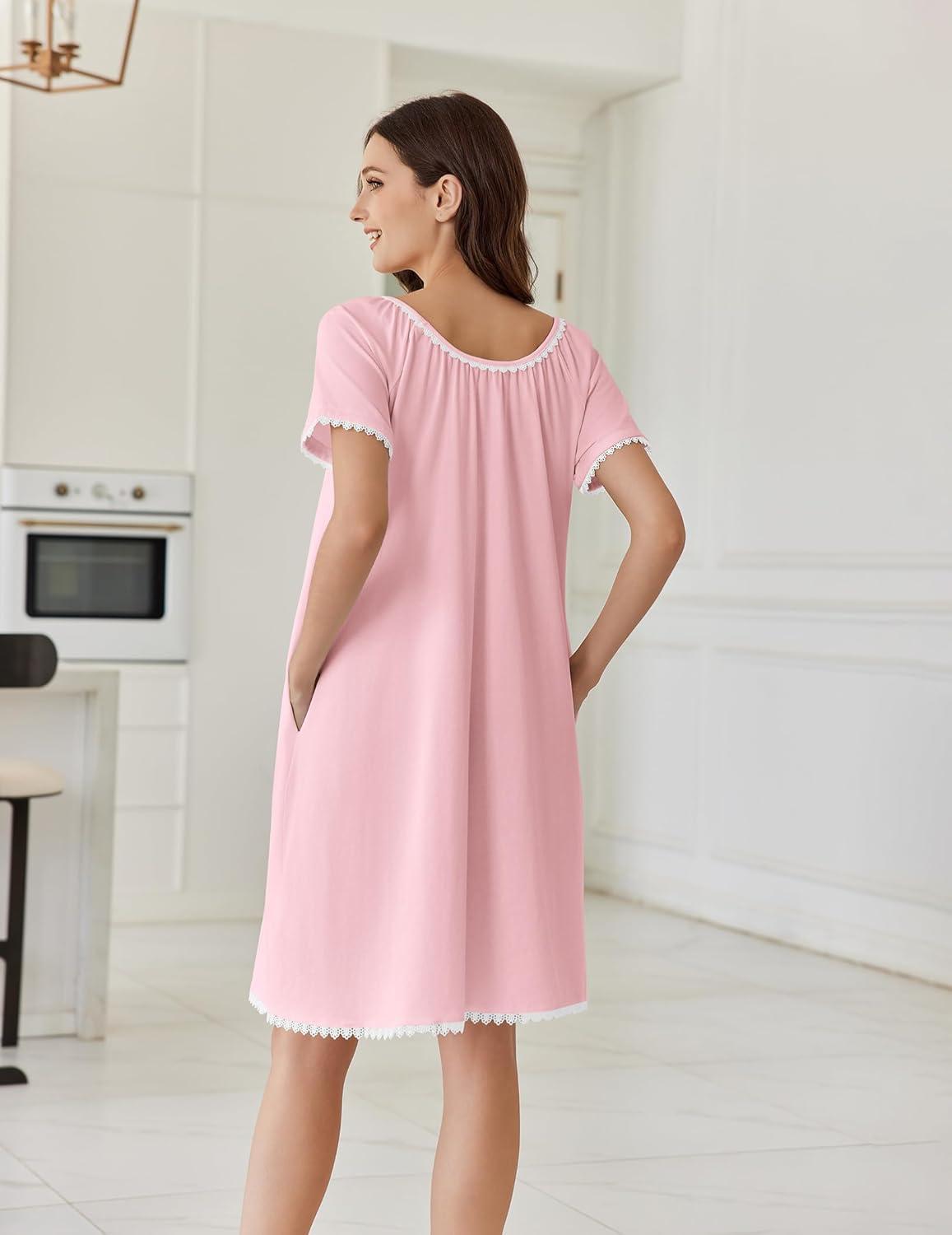 Ekouaer Cotton Nightgowns for Women Lace Trim Sleep Shirts Short Sleeve Night Shirts Sleep Dress with Pockets(Pink)