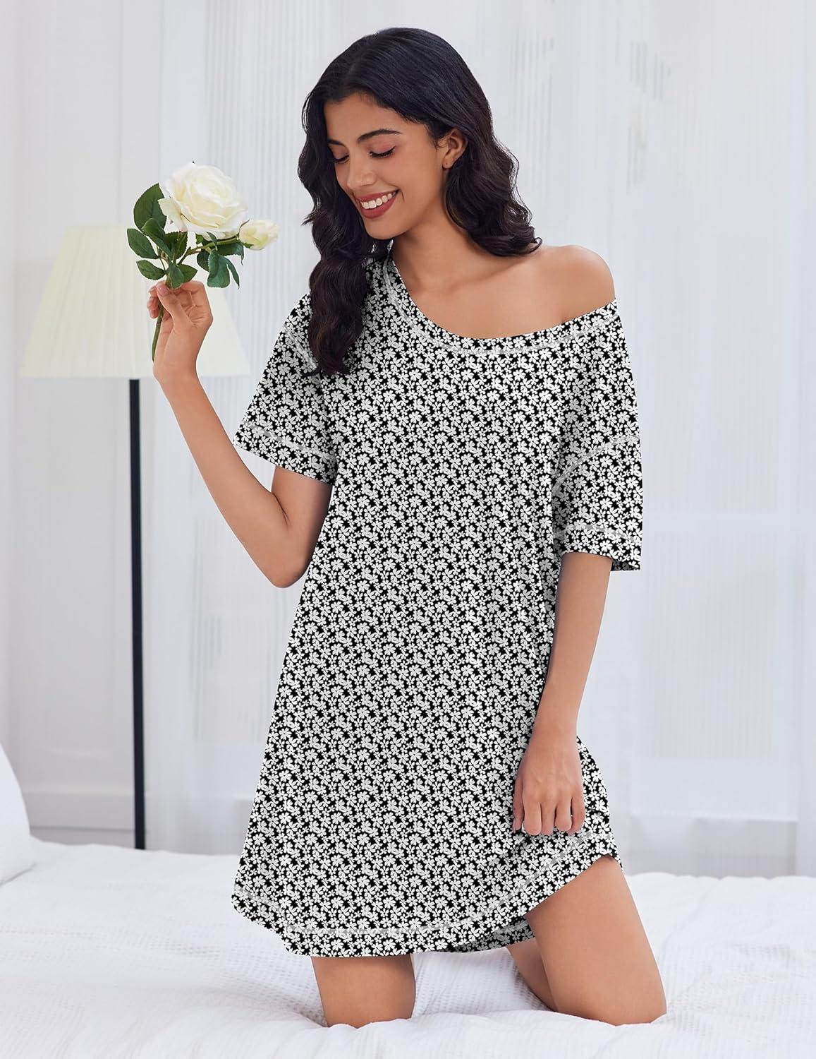 Ekouaer Cotton Nightgowns for Women Oversized Sleepshirt Tshirt Night Gown Short Sleeve Night Shirt Casual Soft Sleepwear(Black White Floral)