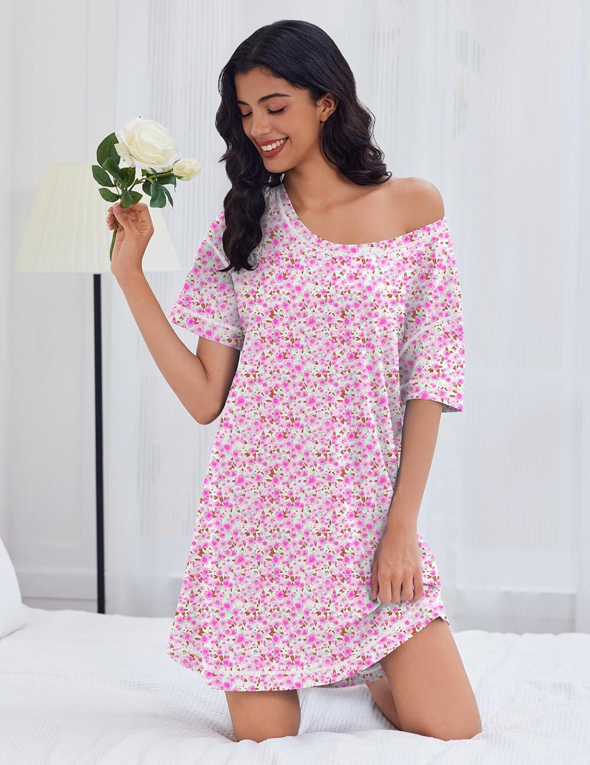 Ekouaer Cotton Nightgowns for Women Oversized Sleepshirt Tshirt Night Gown Short Sleeve Night Shirt Casual Soft Sleepwear(Pink Floral)