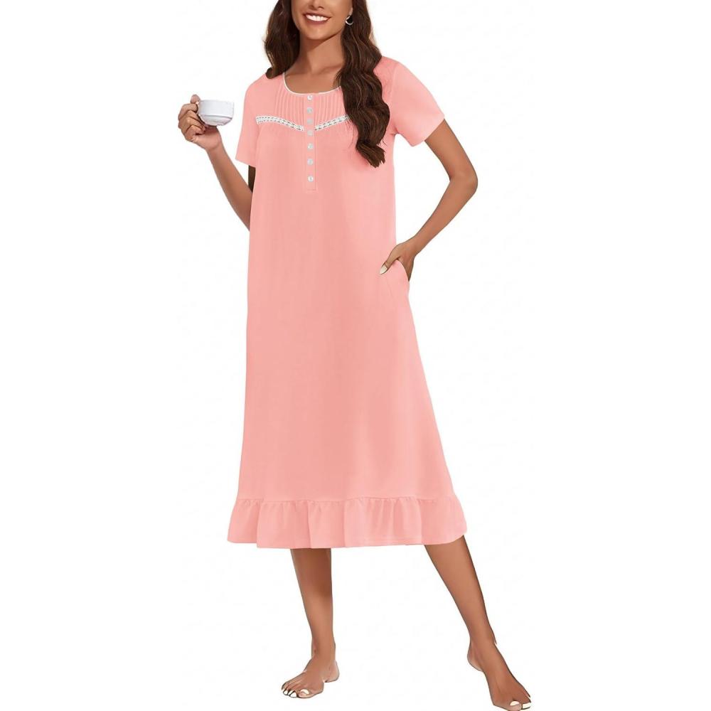Ekouaer Cotton Nightgowns for Women Soft Long Button Night Gowns Comfy House Dress with Pockets Short Sleeve Sleepwear S-3XL(Light Pink)