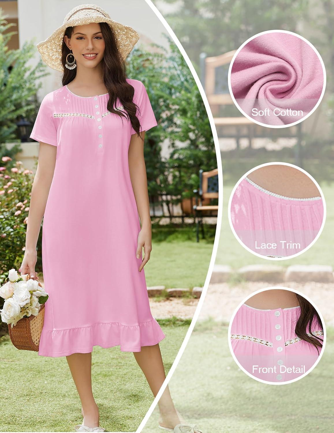 Ekouaer Cotton Nightgowns for Women Soft Long Button Night Gowns Comfy House Dress with Pockets Short Sleeve Sleepwear S-3XL(Pink)