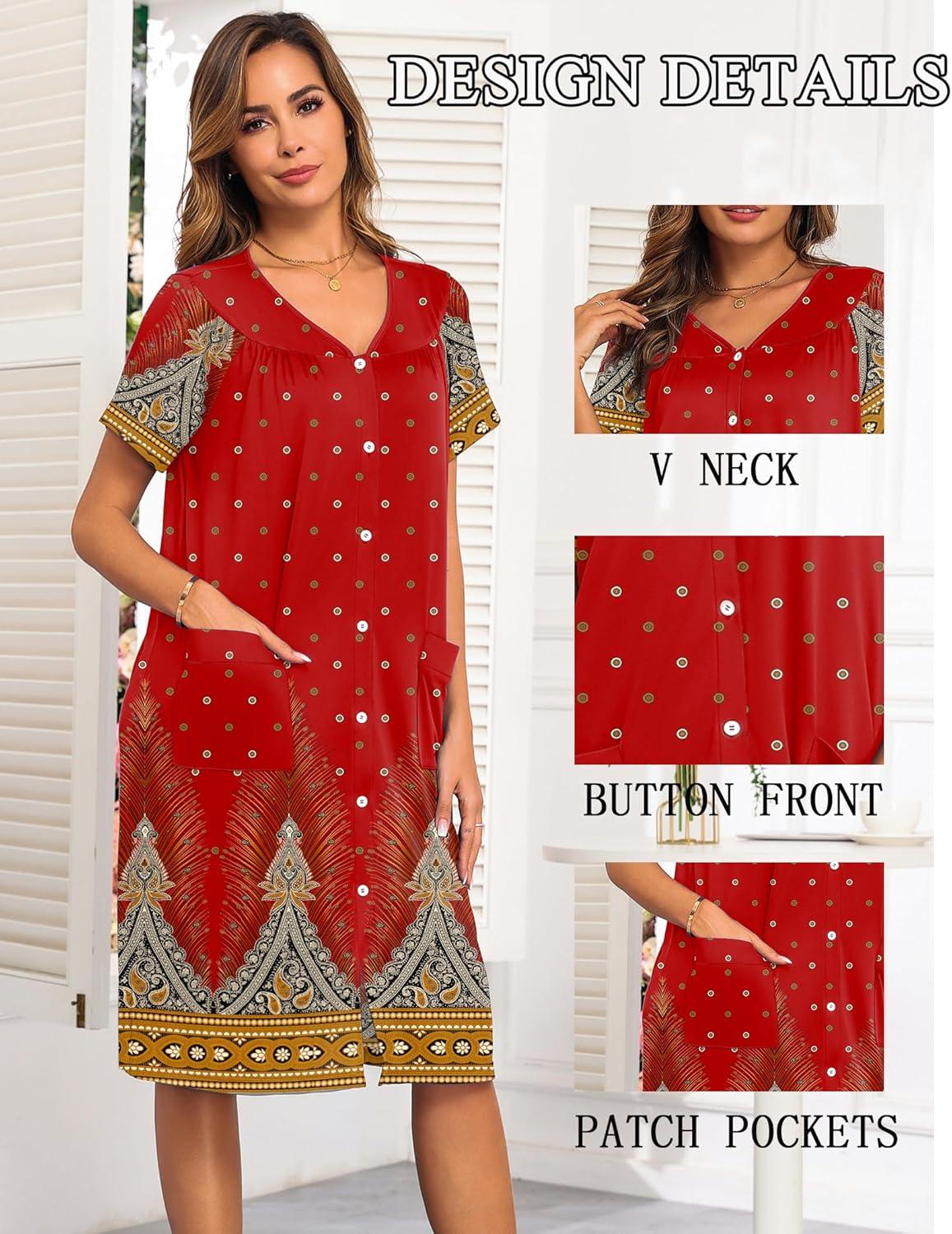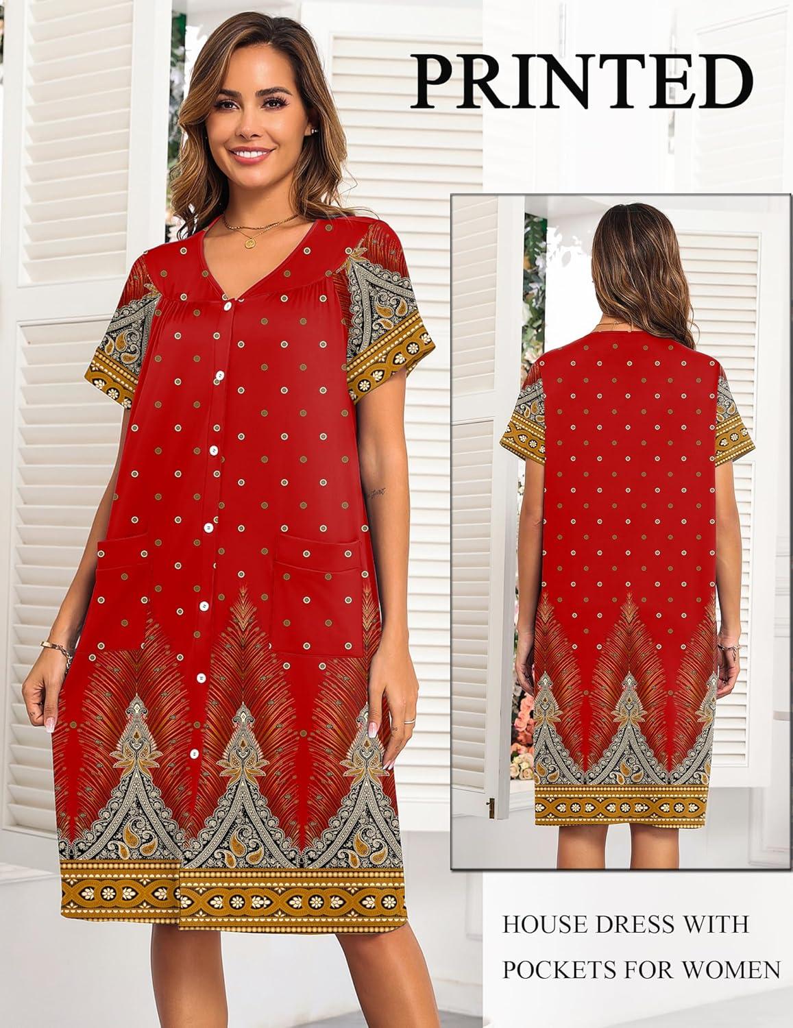 Ekouaer House Dresses for Women with Pockets Button Down Nightgowns Plus Size Moo Moos Mumu Dresses Floral Print S-3XL(Ethnic Red)