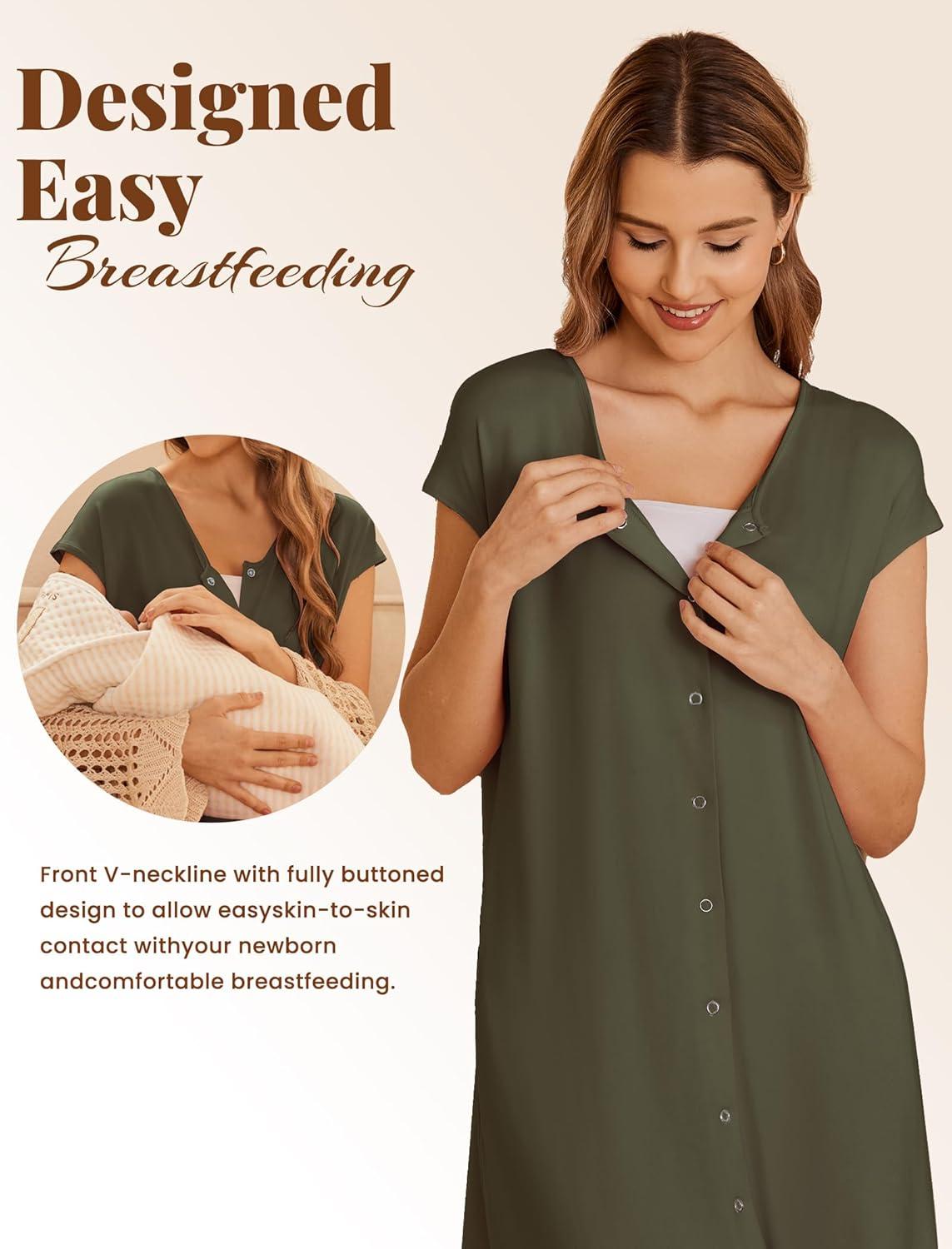 Ekouaer Labor/Delivery/Hospital Gown Nursing Nightgown Maternity Sleepwear With Pockets Postpartum Gowns with Button S-XXL(Army Green)