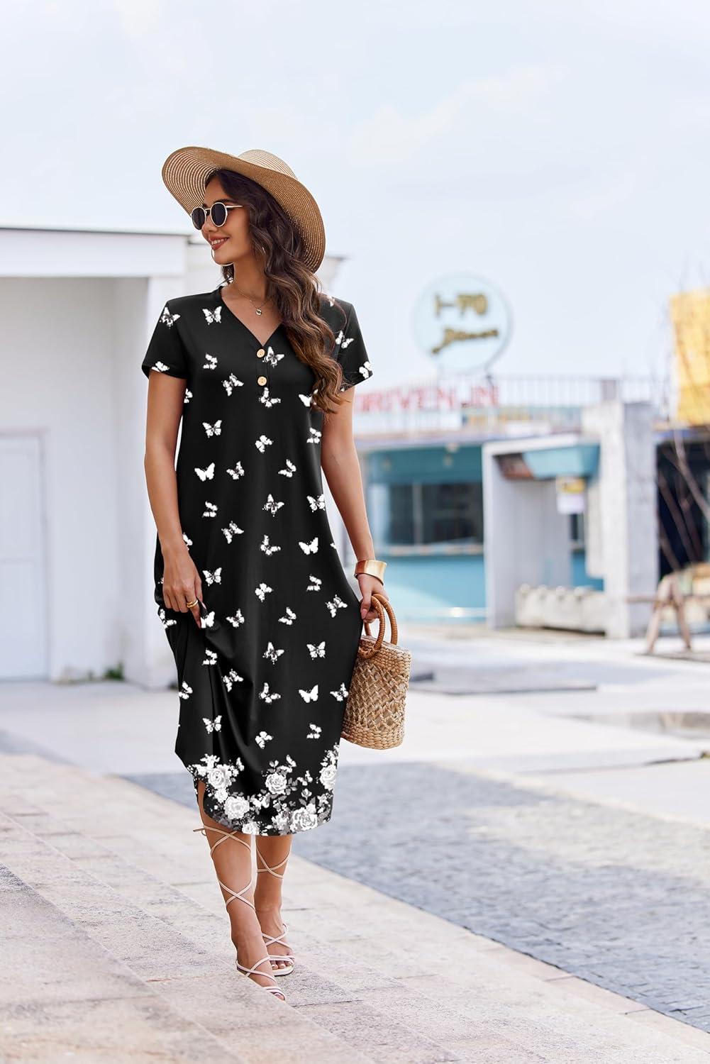 Ekouaer Long Nightgowns for Women Button Night Gowns Short Sleeve Sleepwear Full Length Sleep Shirts With Pockets S-3XL(Butterfly)