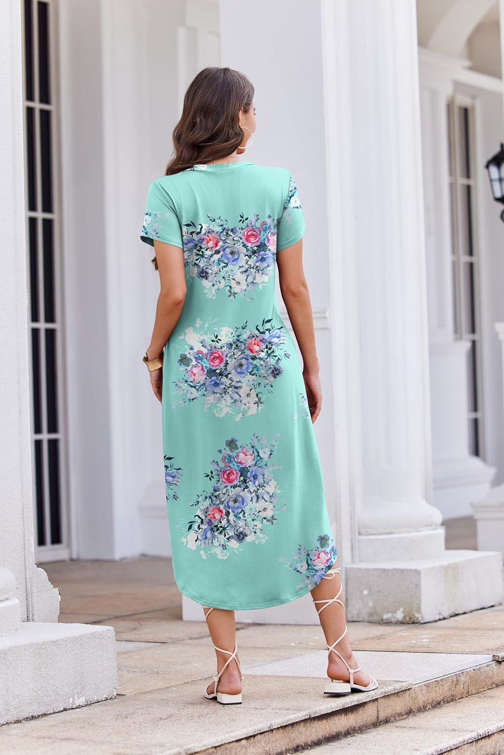 Ekouaer Long Nightgowns for Women Button Night Gowns Short Sleeve Sleepwear Full Length Sleep Shirts With Pockets S-3XL(Flower Light Blue)