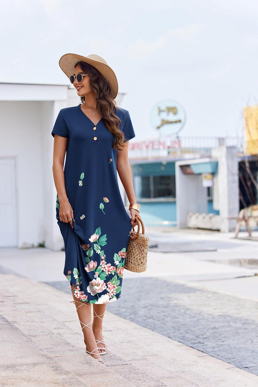 Ekouaer Long Nightgowns for Women Button Night Gowns Short Sleeve Sleepwear Full Length Sleep Shirts With Pockets S-3XL(Rose Red Flower)