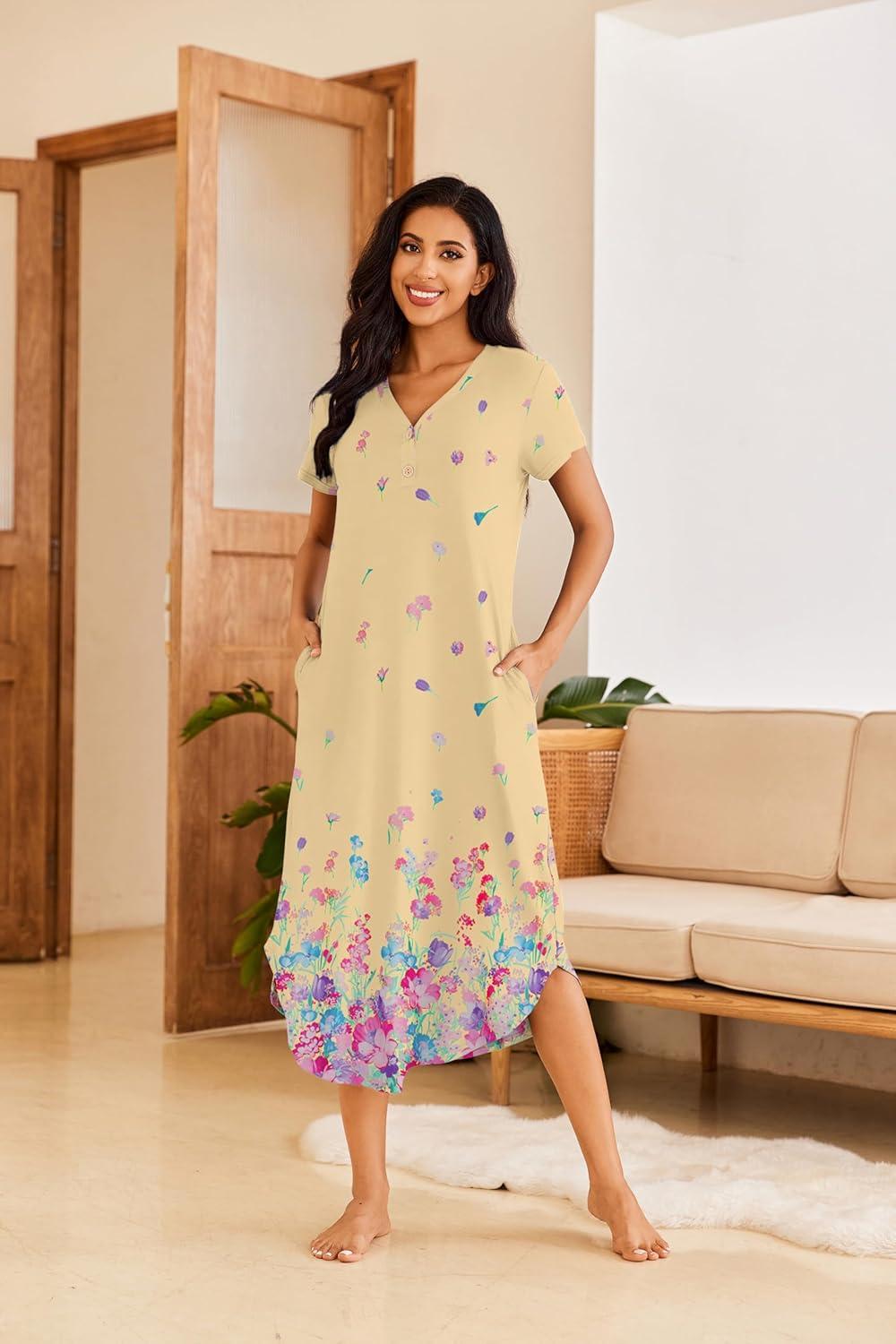 Ekouaer Long Nightgowns for Women Button Night Gowns Short Sleeve Sleepwear Full Length Sleep Shirts With Pockets S-3XL(Red Flower)