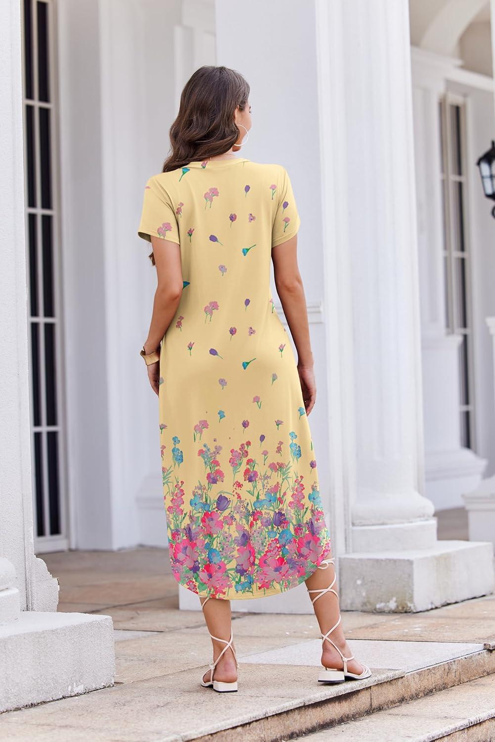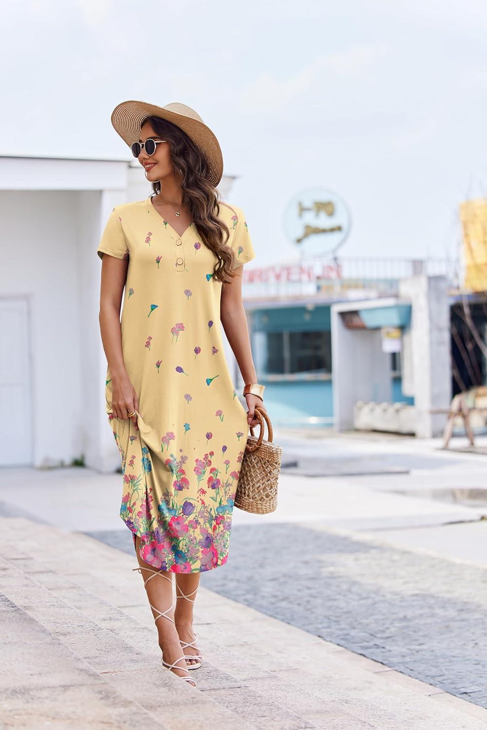 Ekouaer Long Nightgowns for Women Button Night Gowns Short Sleeve Sleepwear Full Length Sleep Shirts With Pockets S-3XL(Rose Red Flower)