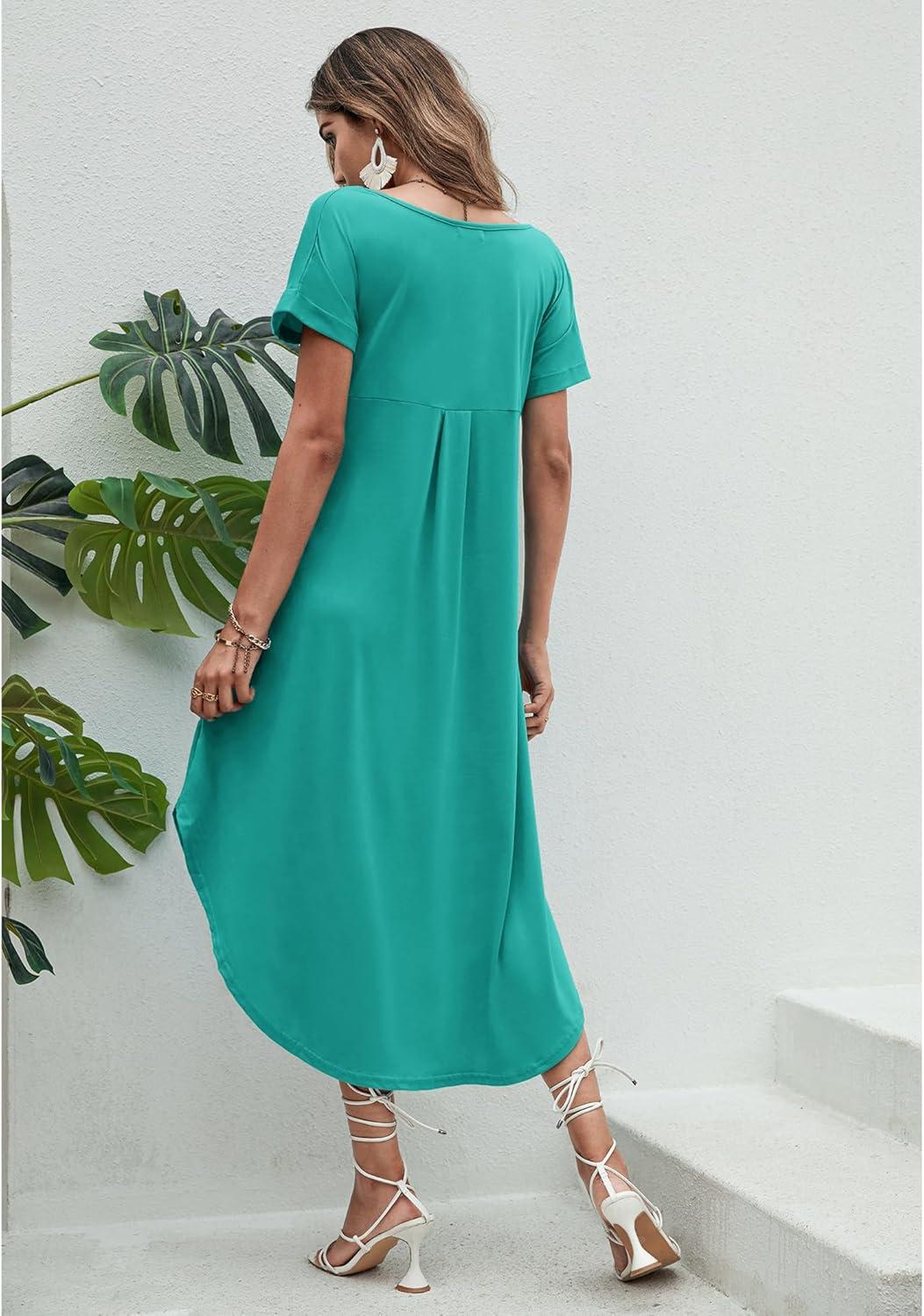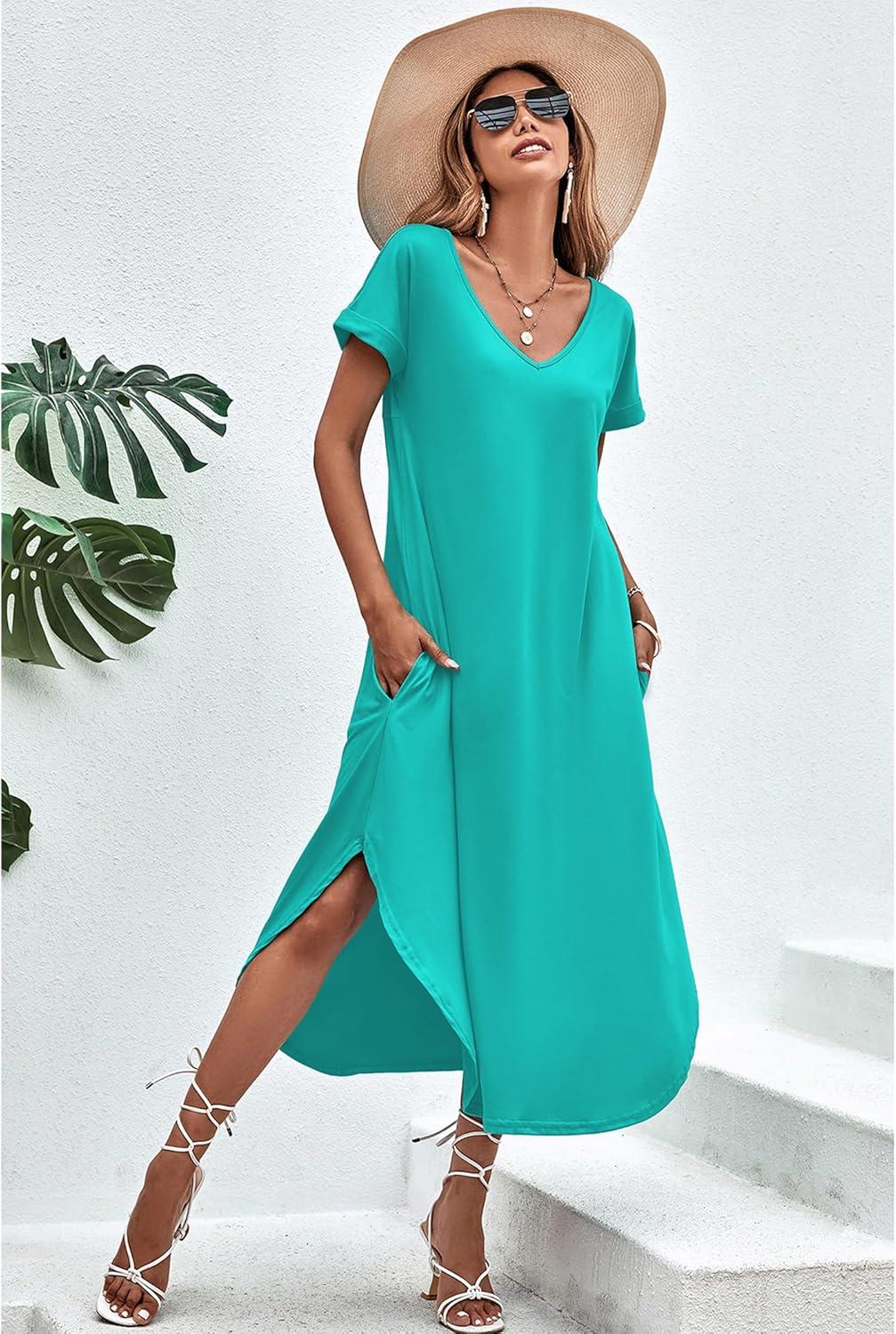 Ekouaer Long Nightgowns for Women Short Sleeve House Dress with Pockets V Neck Sleepshirts Side Split Sleepwear S-4XL(Aqua Green)