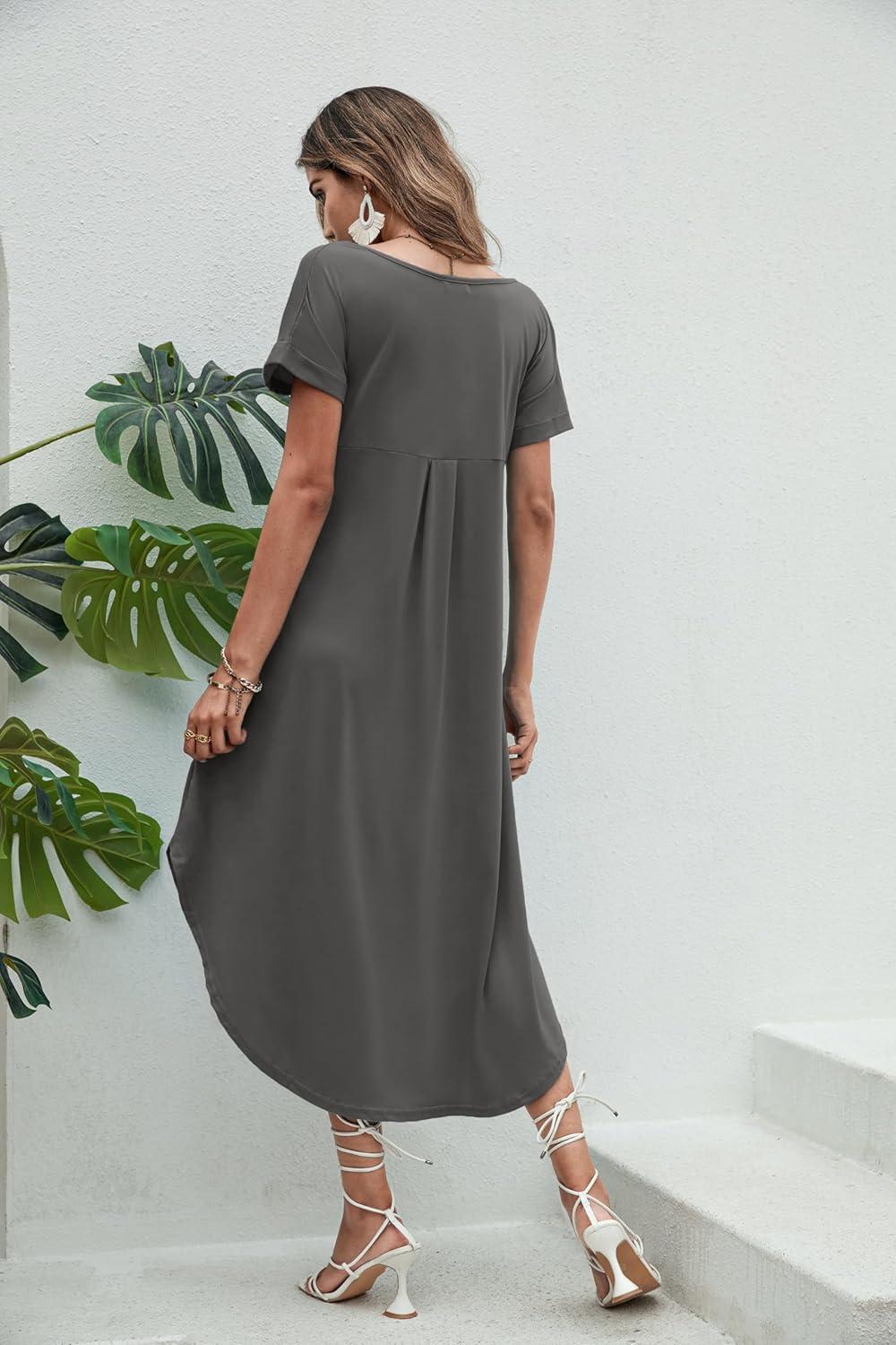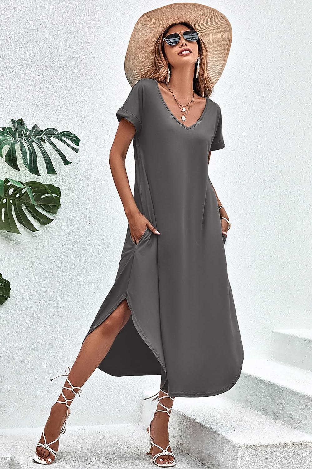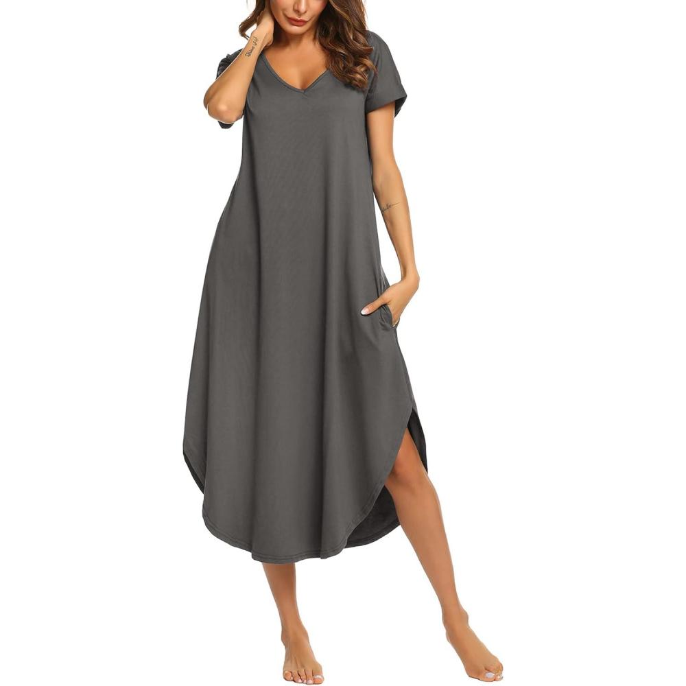 Ekouaer Long Nightgowns for Women Short Sleeve House Dress with Pockets V Neck Sleepshirts Side Split Sleepwear S-4XL(Dark Grey)