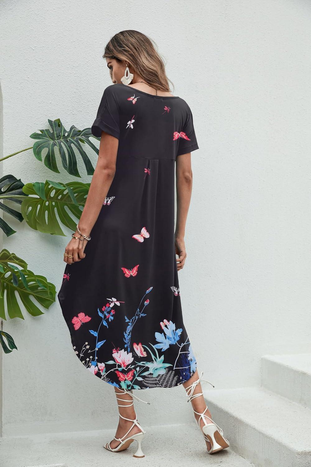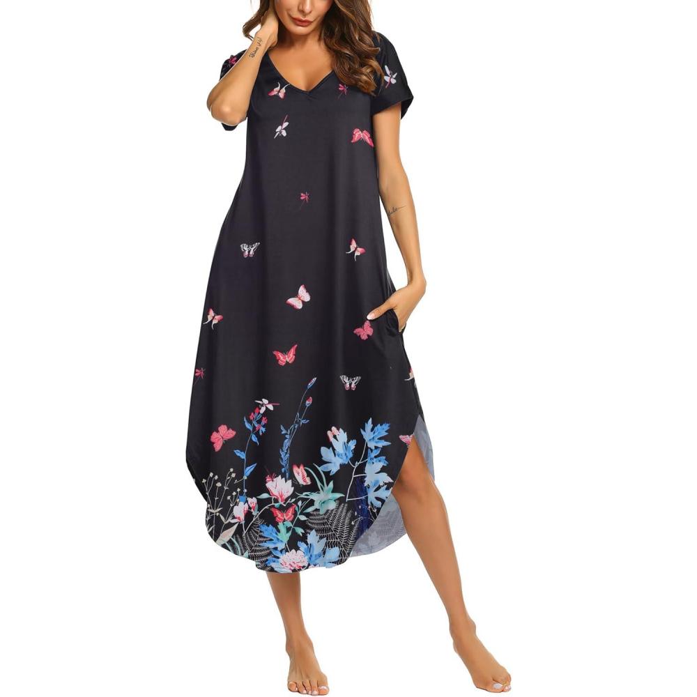 Ekouaer Long Nightgowns for Women Short Sleeve House Dress with Pockets V Neck Sleepshirts Side Split Sleepwear S-4XL(Flower Butterfly)