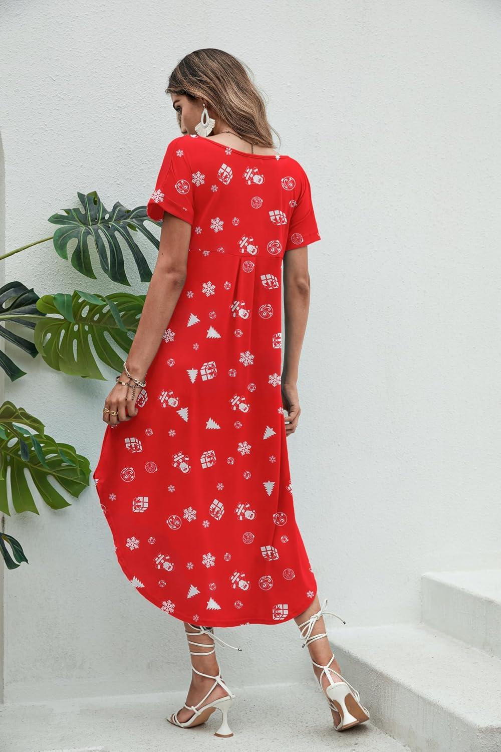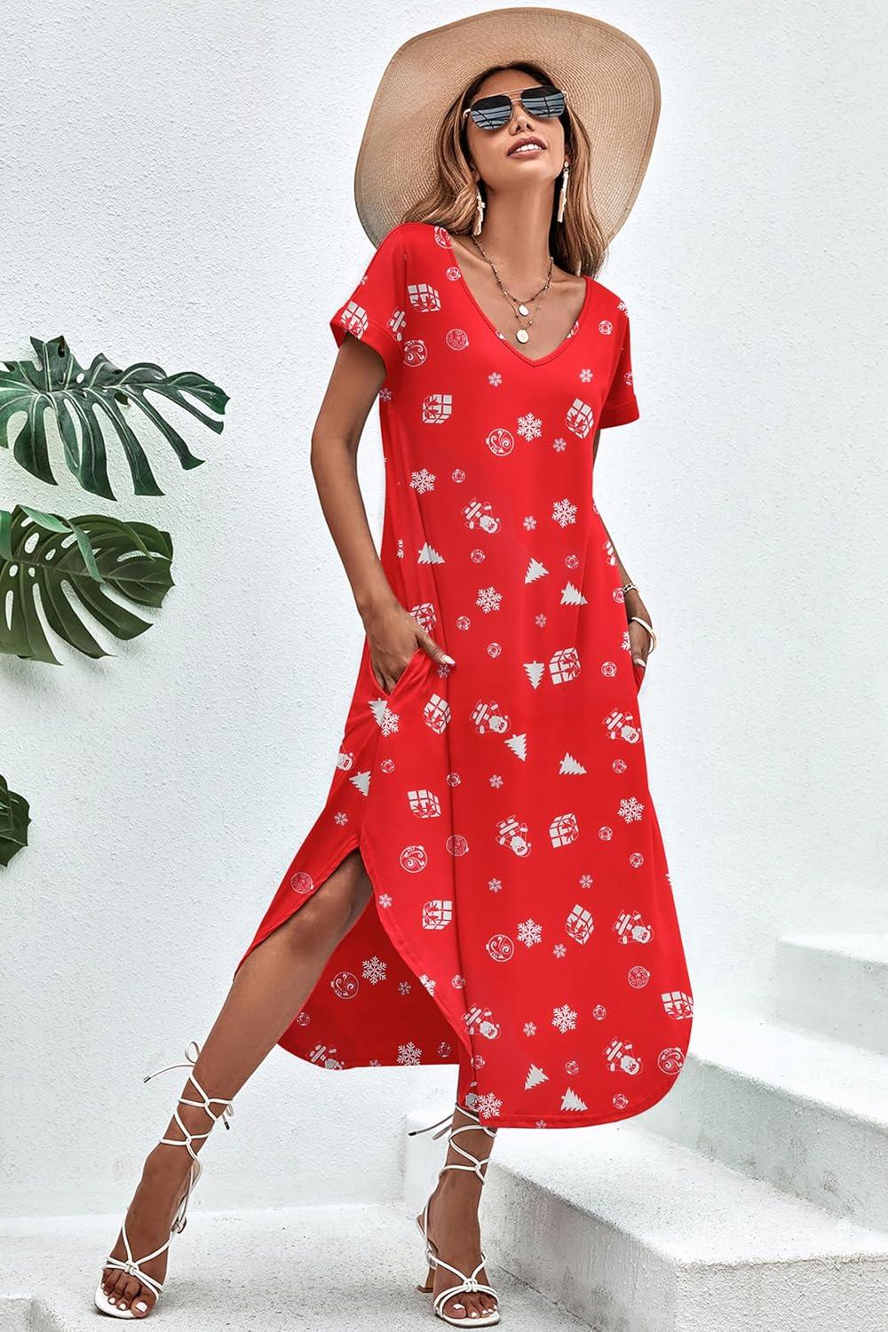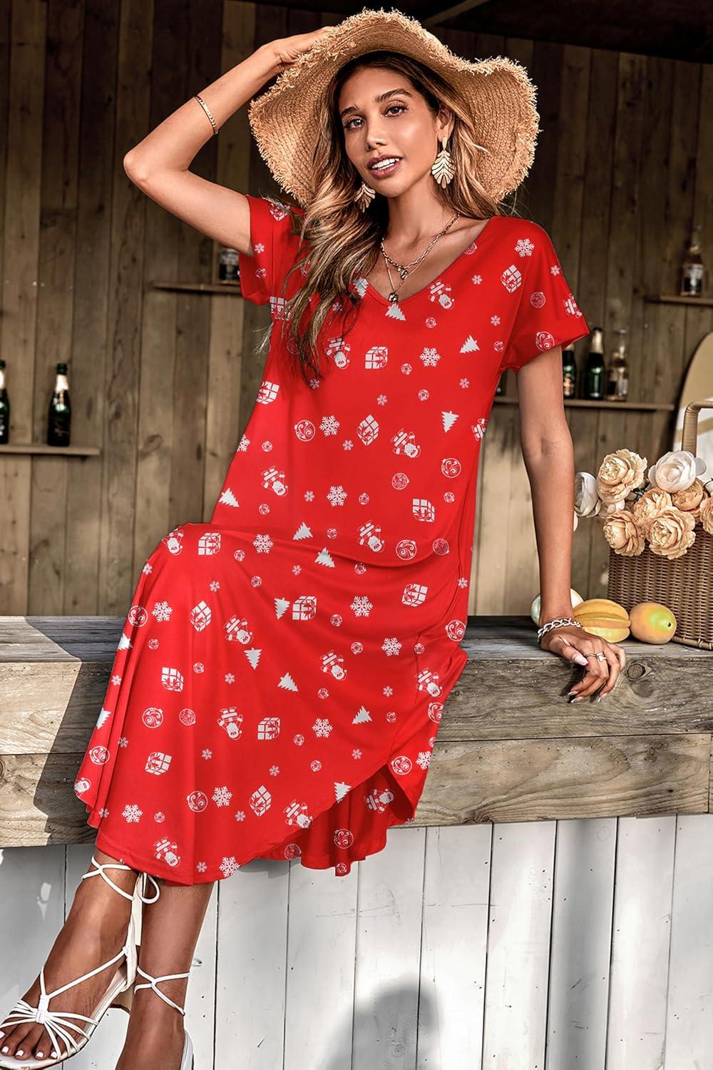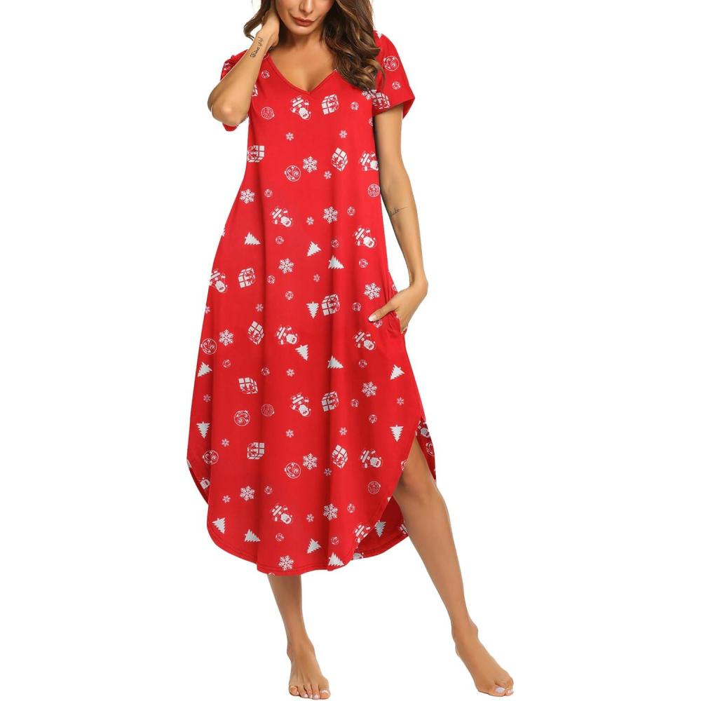 Ekouaer Long Nightgowns for Women Short Sleeve House Dress with Pockets V Neck Sleepshirts Side Split Sleepwear S-4XL(Red Christmas)
