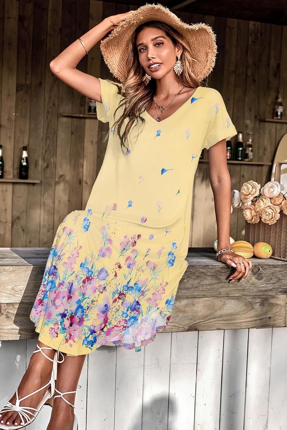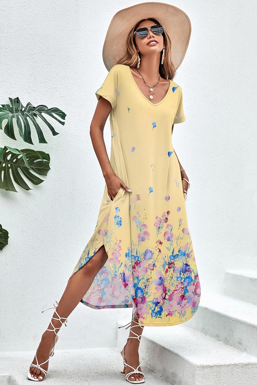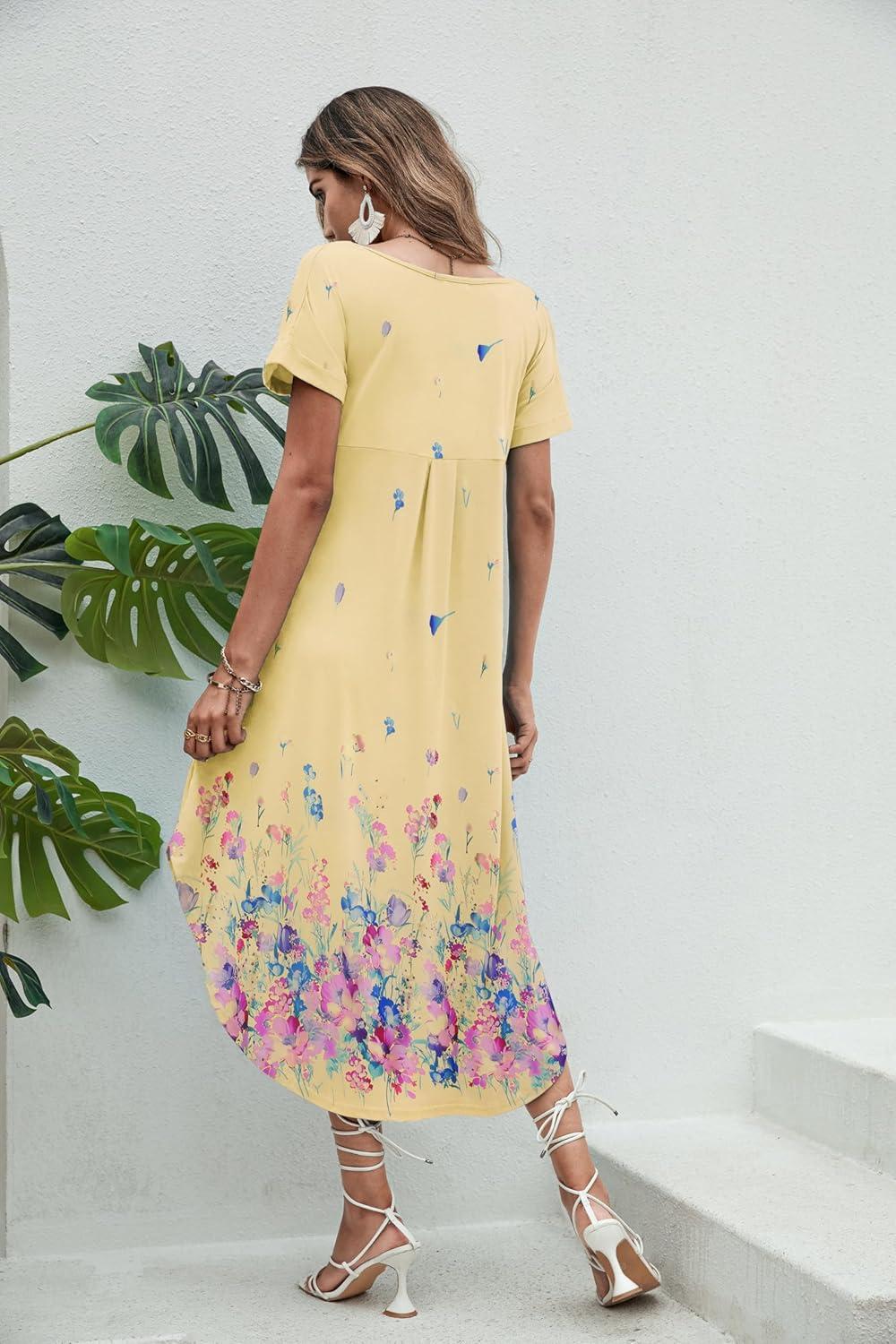 Ekouaer Long Nightgowns for Women Short Sleeve House Dress with Pockets V Neck Sleepshirts Side Split Sleepwear S-4XL(Yellow Floral)
