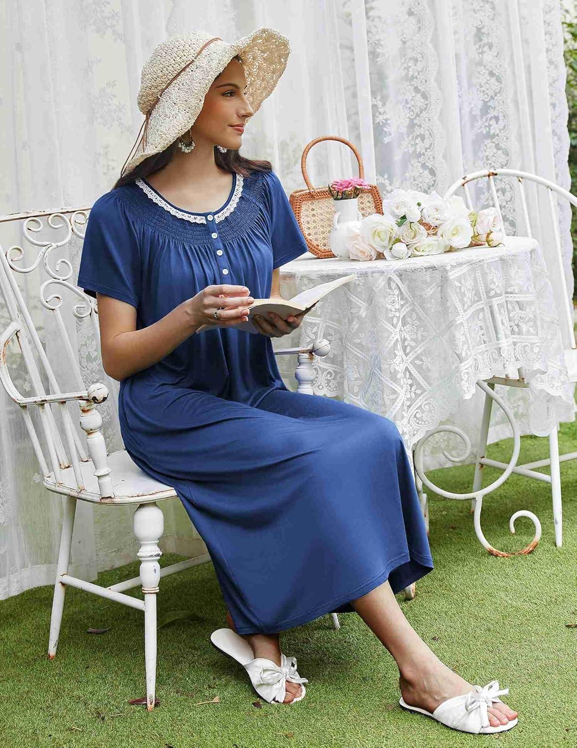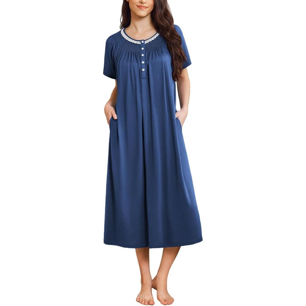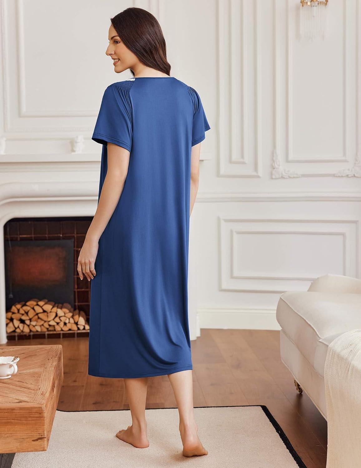 Ekouaer Long Nightgowns for Women Short Sleeve Sleepshirt Button Sleep Dress with Pockets(Blue)