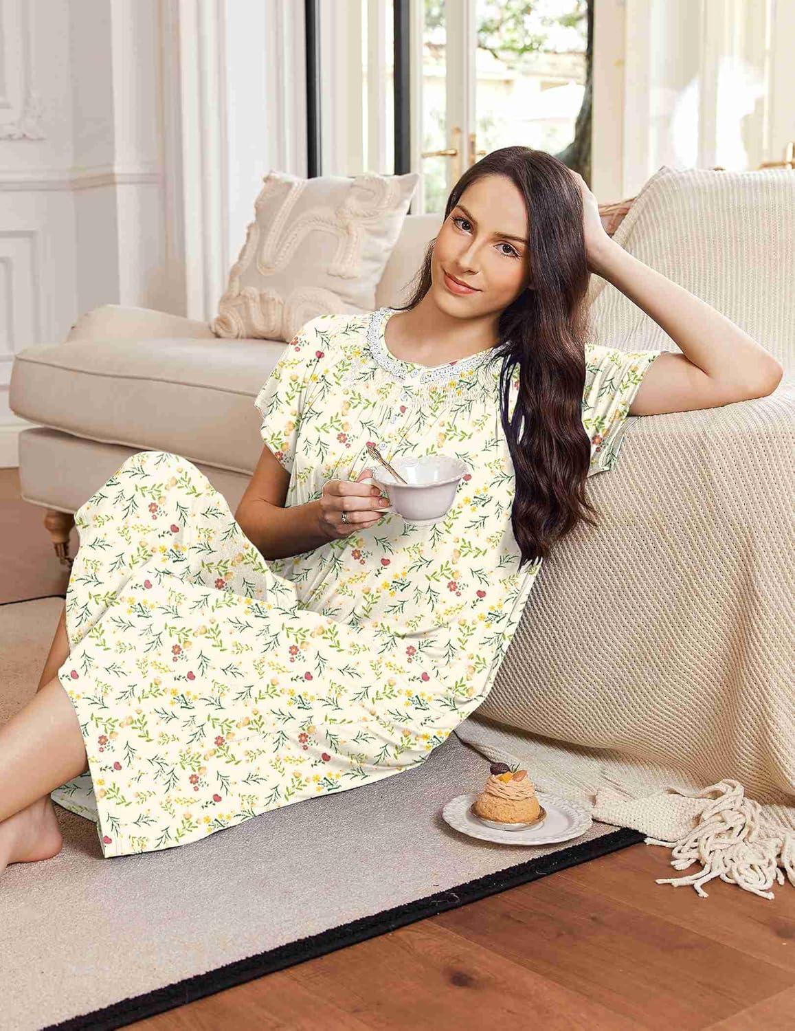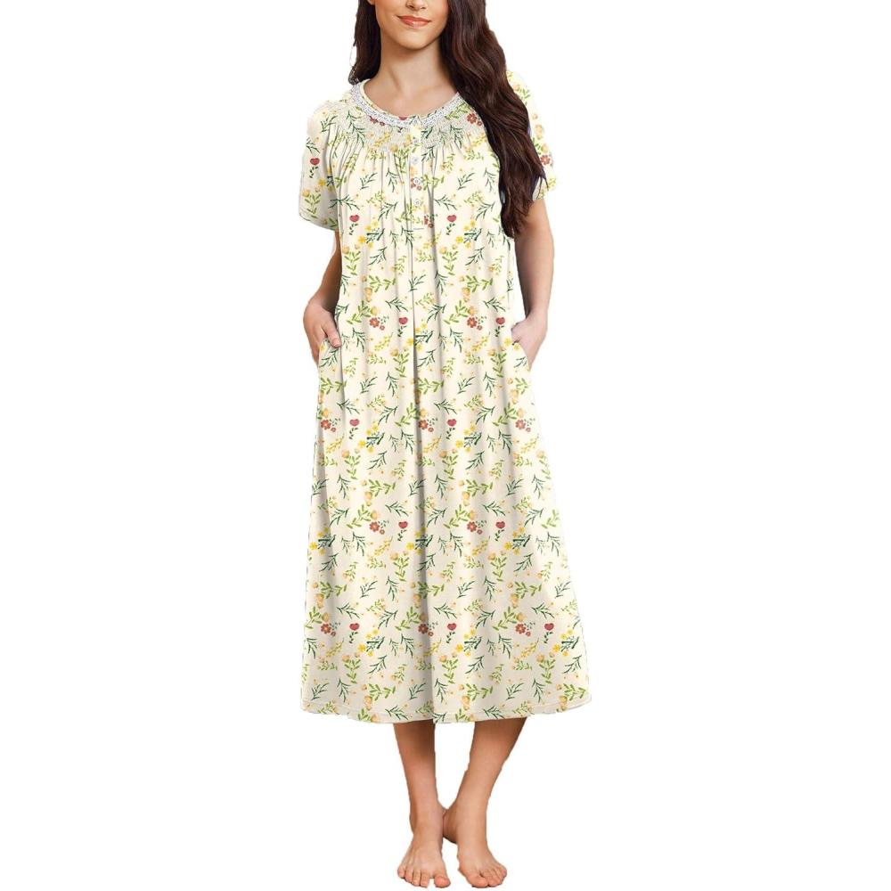 Ekouaer Long Nightgowns for Women Short Sleeve Sleepshirt Button Sleep Dress with Pockets(Green Leaf)