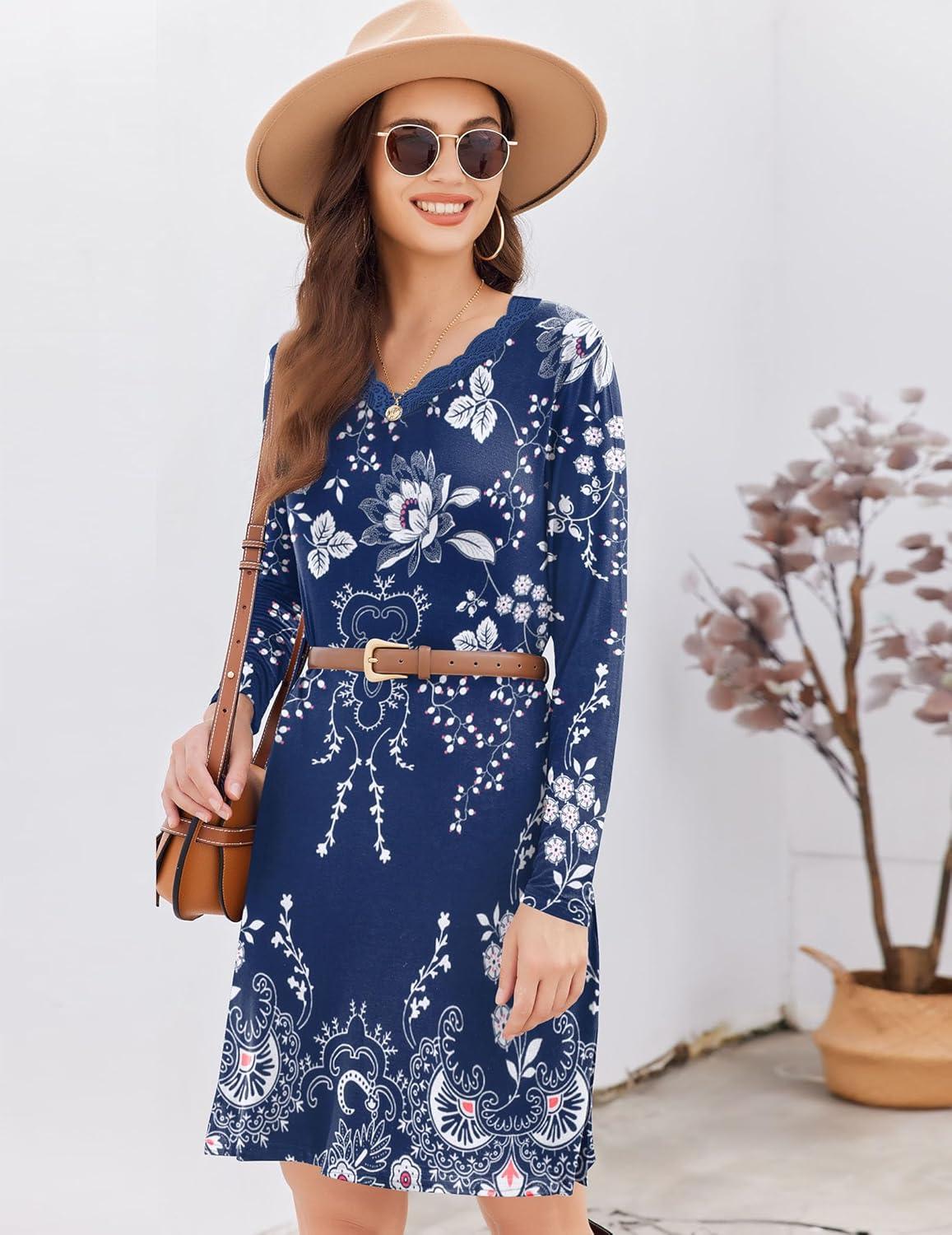 Ekouaer Long Sleeve Nightgowns for Women Sexy Lace Night Shirt V Neck Sleep Shirt Soft Sleepwear(Navy Flower Vine)
