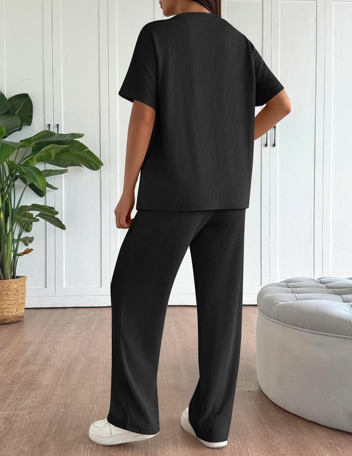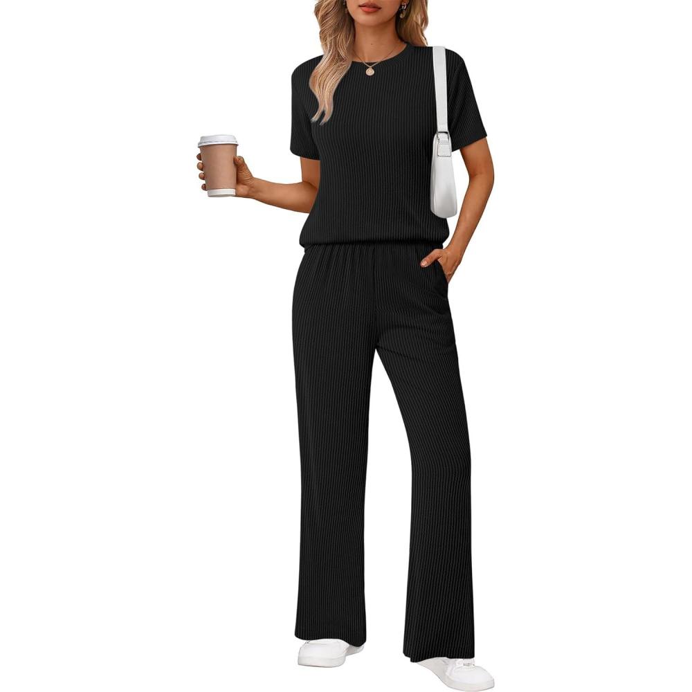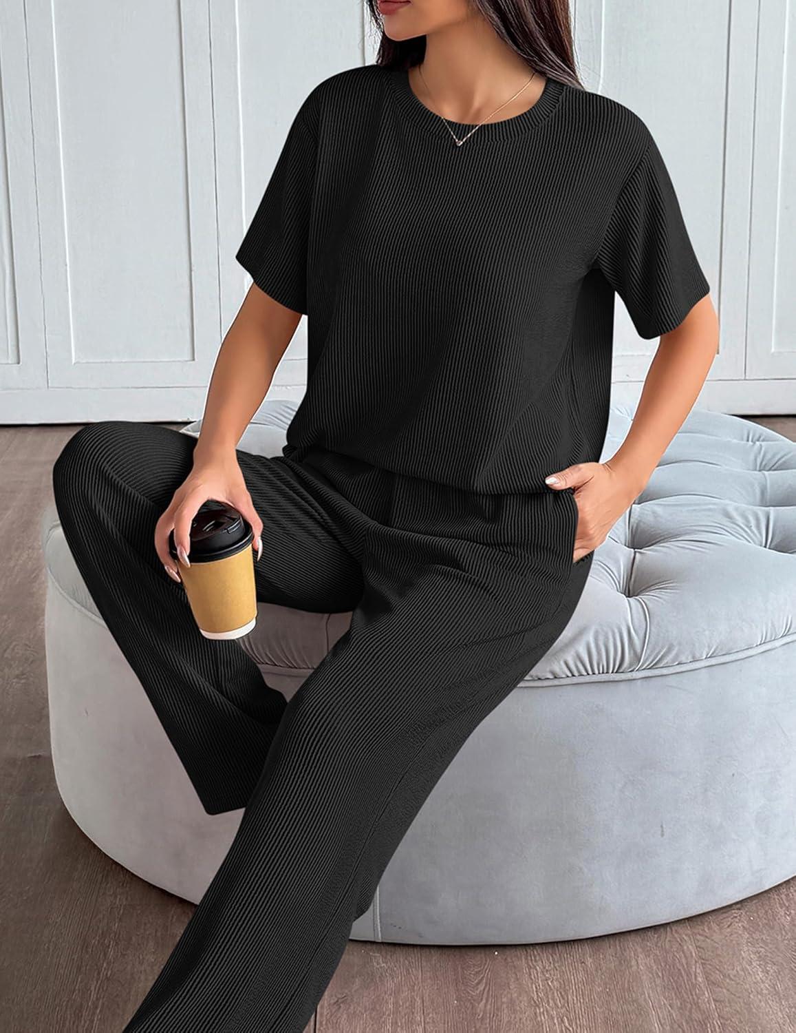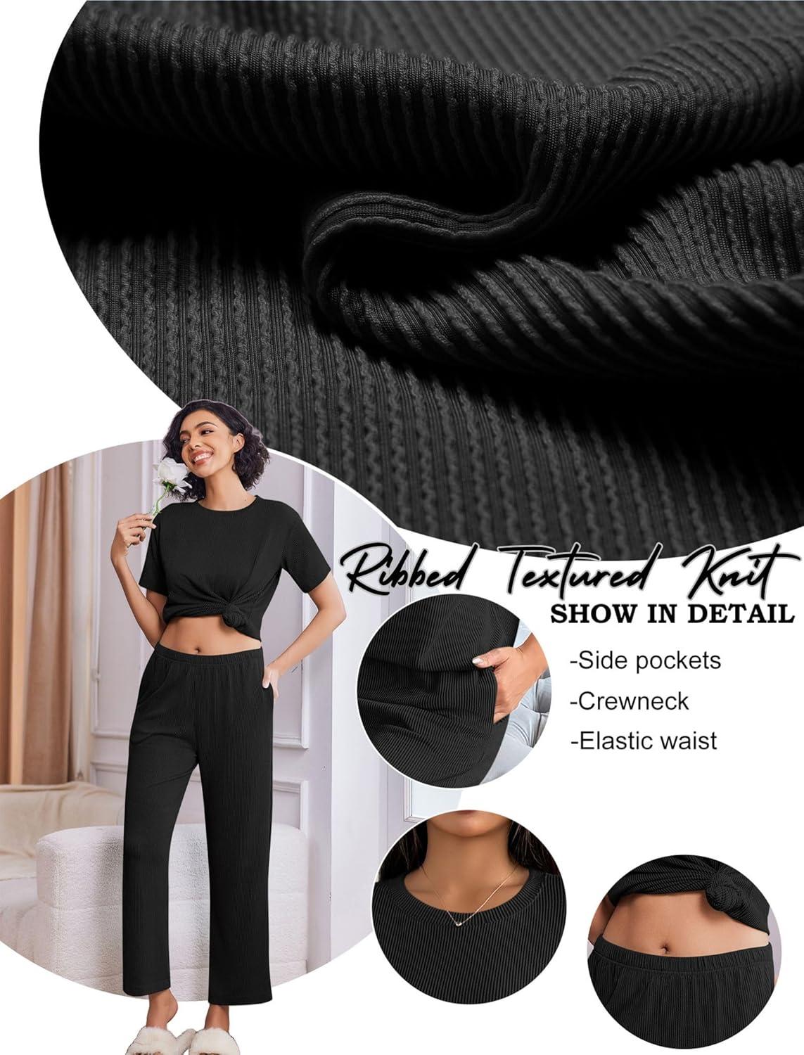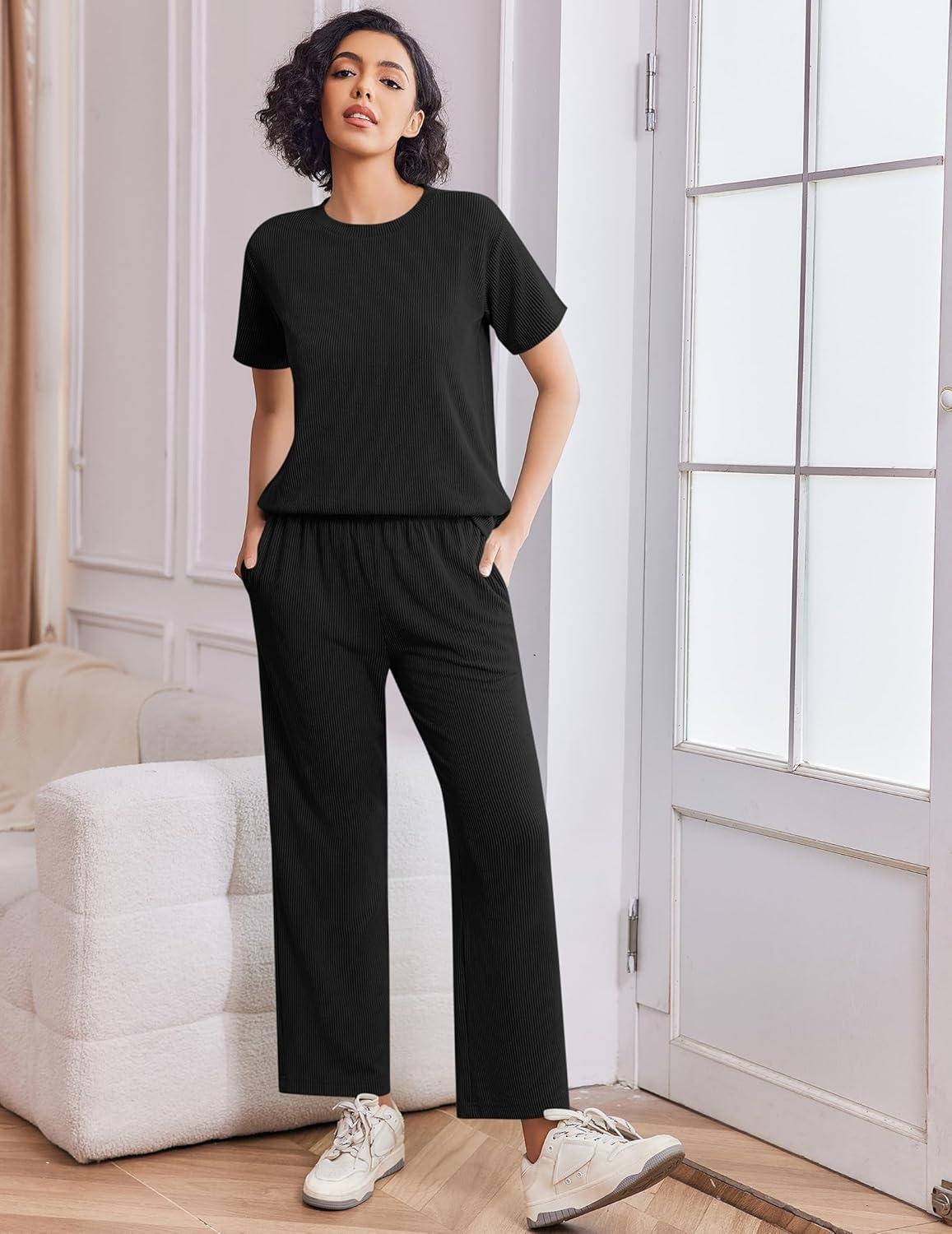 Ekouaer Lounge Set for Women 2 Piece Sets Outfits Top and Long Pants Ribbed Textured Knit Matching Pajamas with Pockets(Black)