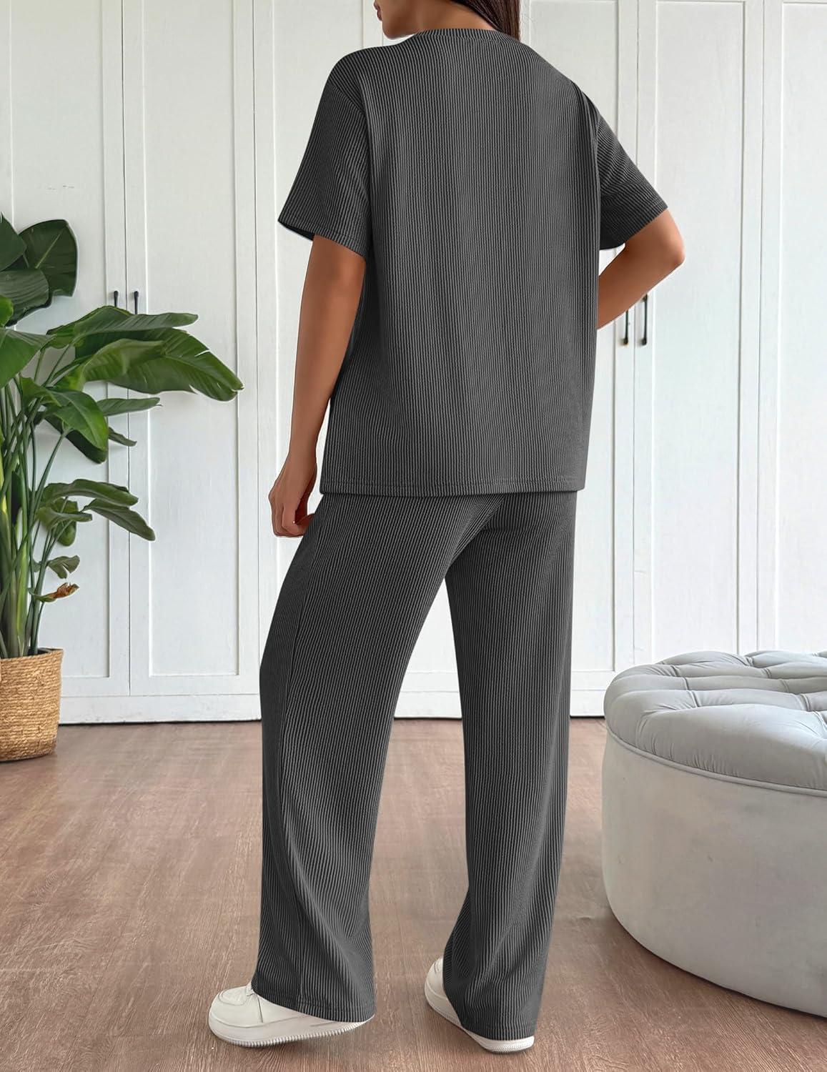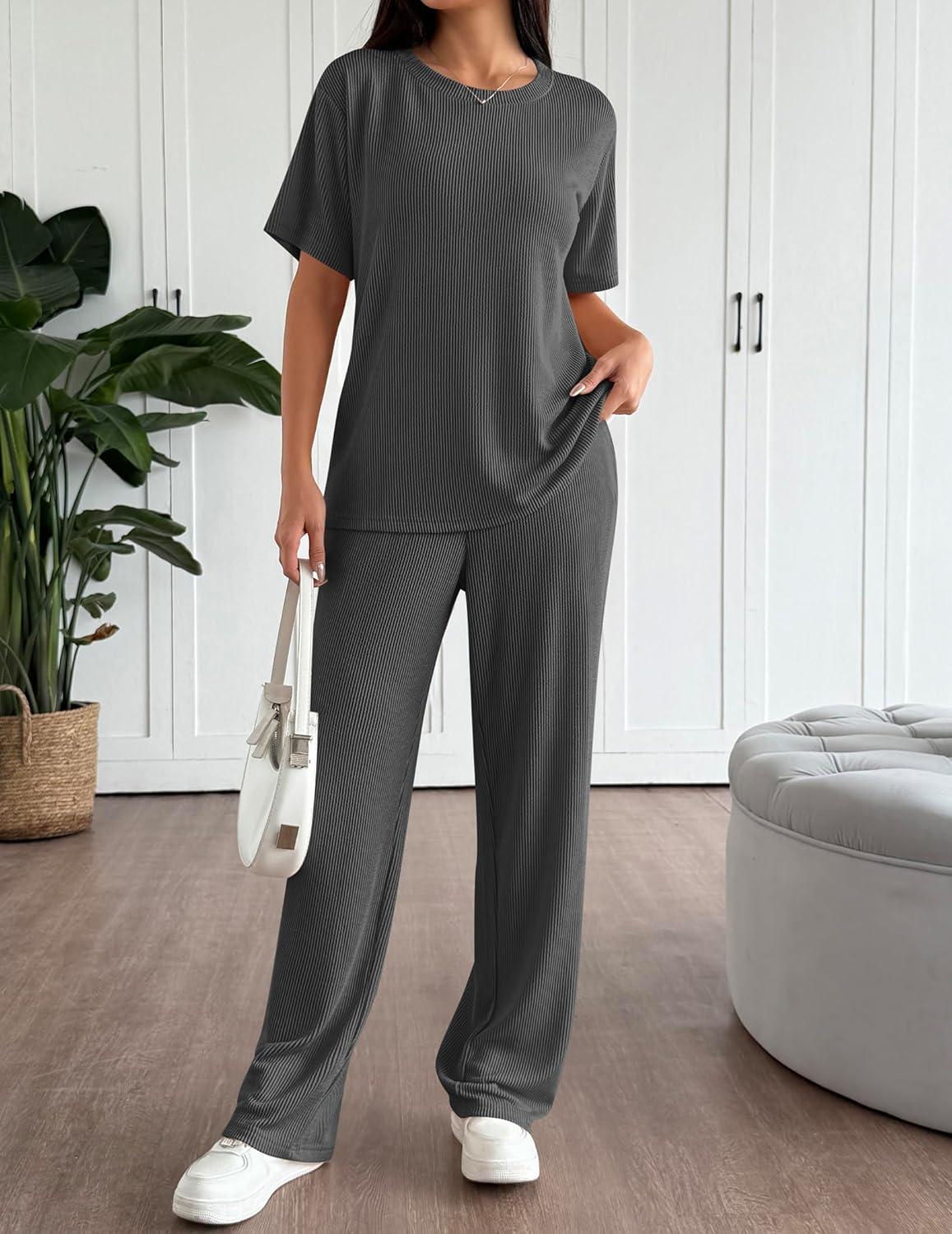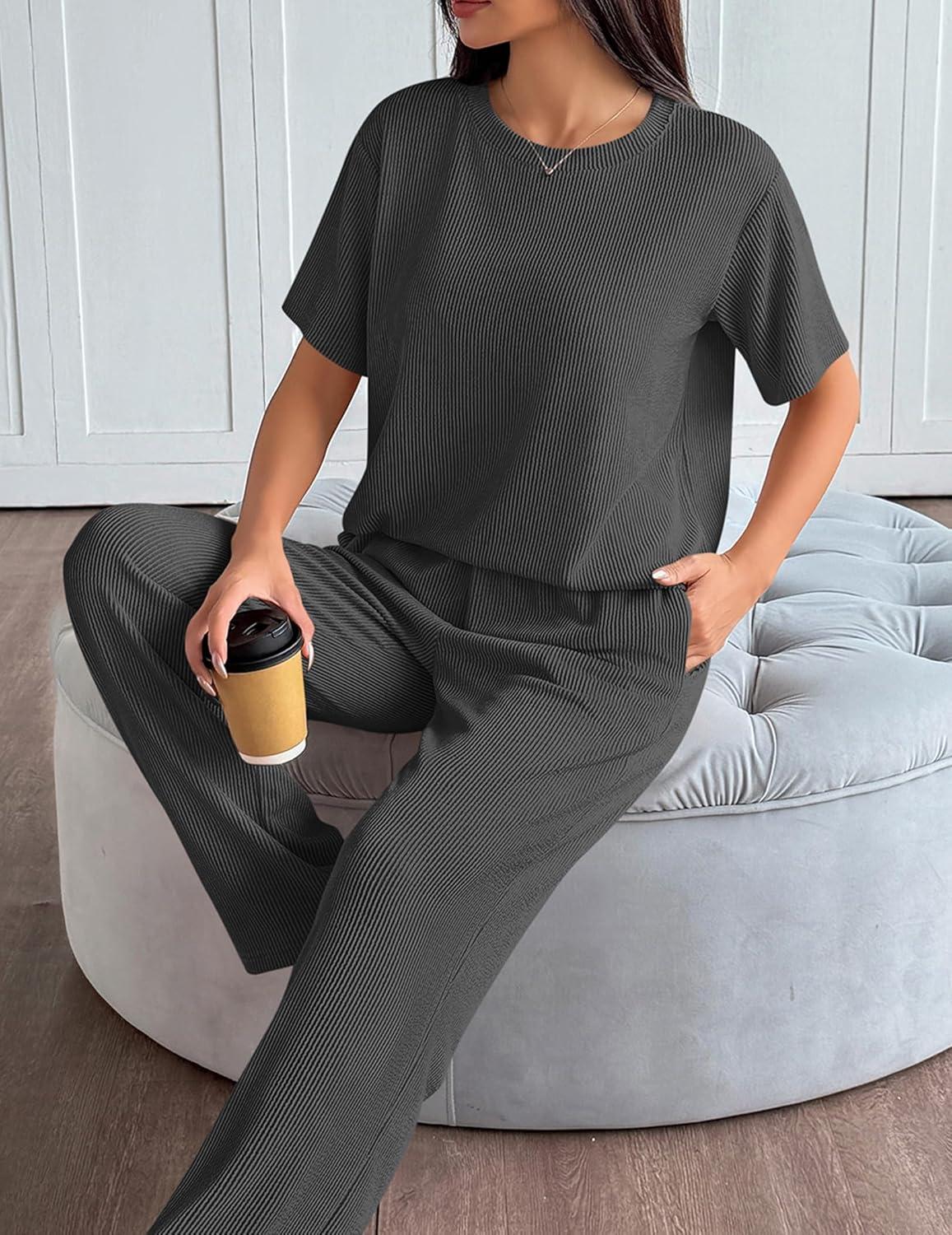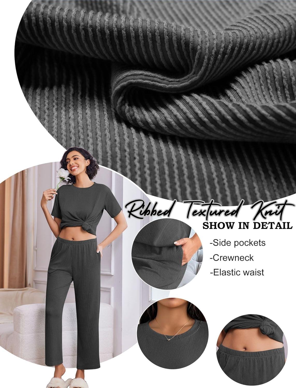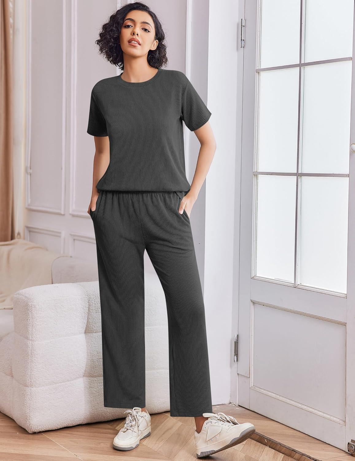 Ekouaer Lounge Set for Women 2 Piece Sets Outfits Top and Long Pants Ribbed Textured Knit Matching Pajamas with Pockets(Dark Grey)