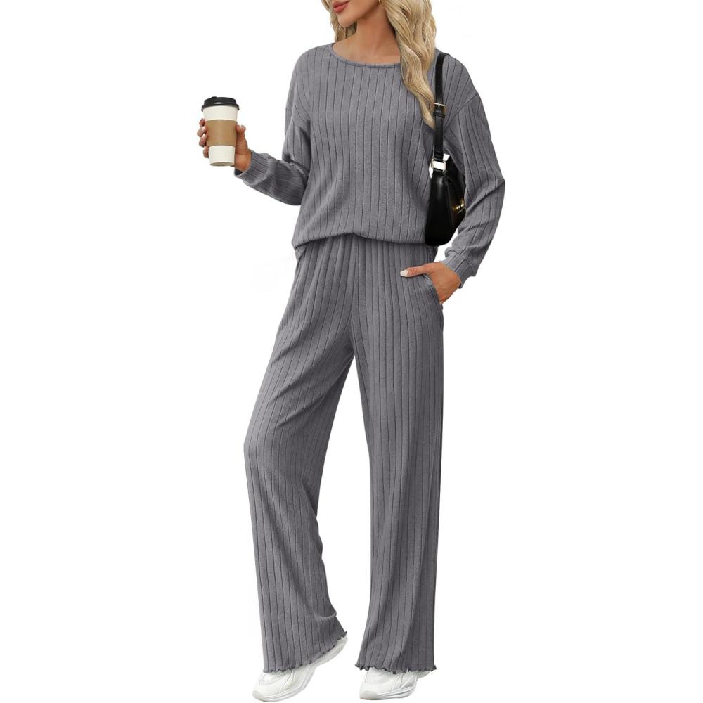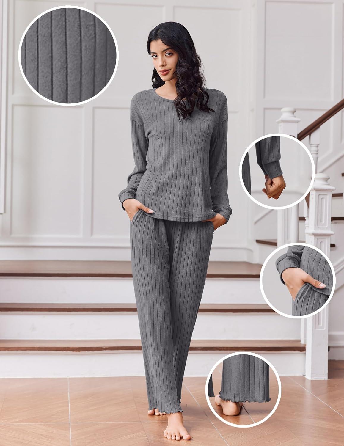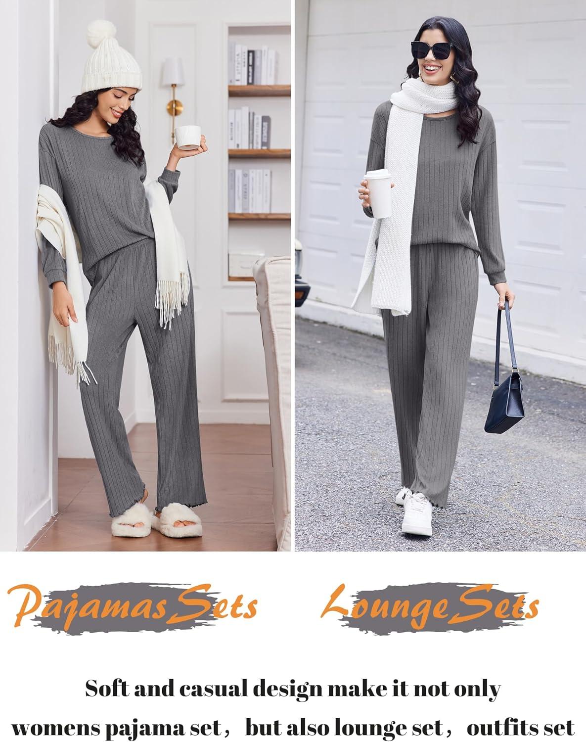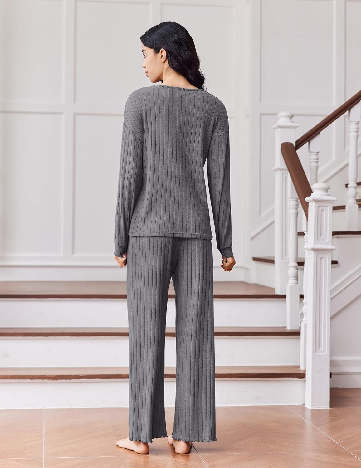 Ekouaer Lounge Sets for Women Comfy Ribbed Knit Pajamas Fall Long Sleeve Sleepwear 2 Piece Casual Loungewear,S-XXL(Grey)