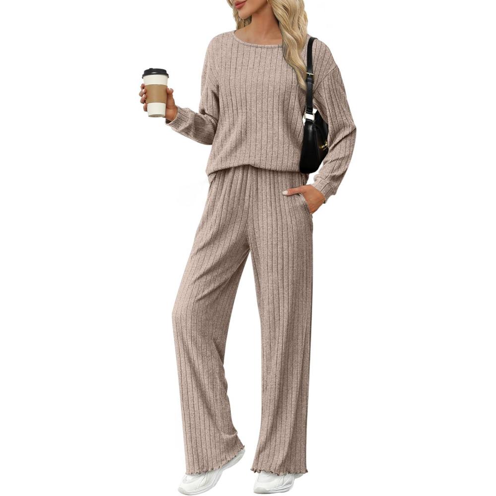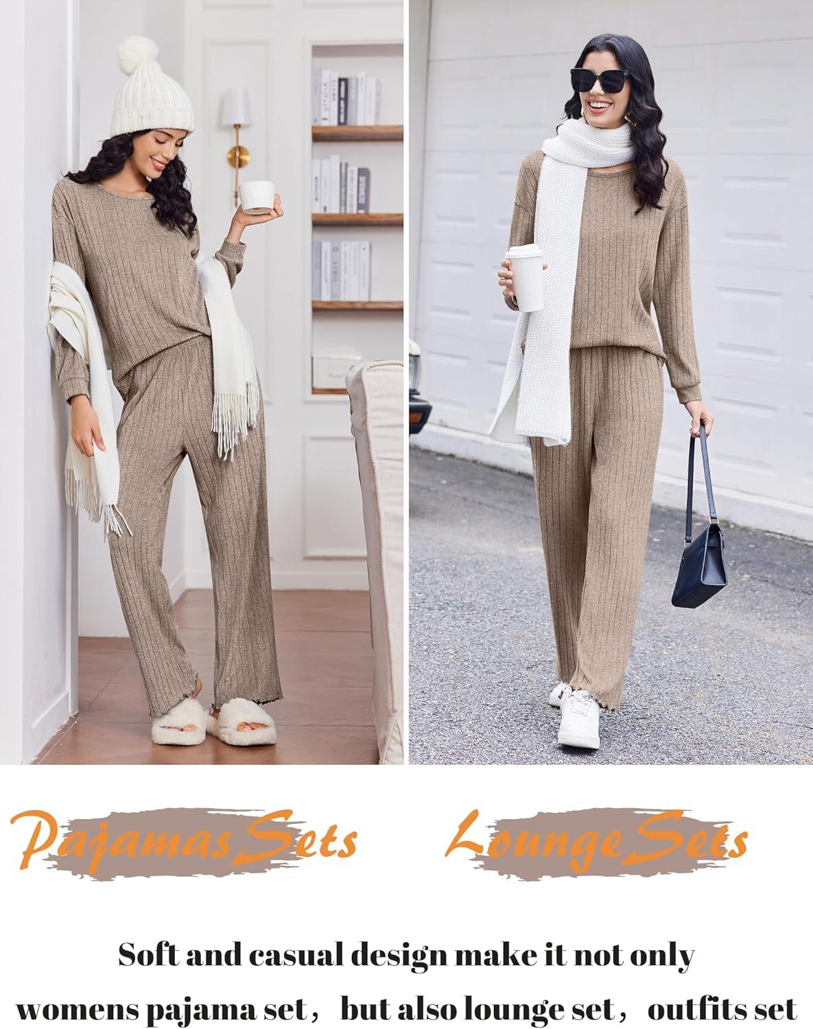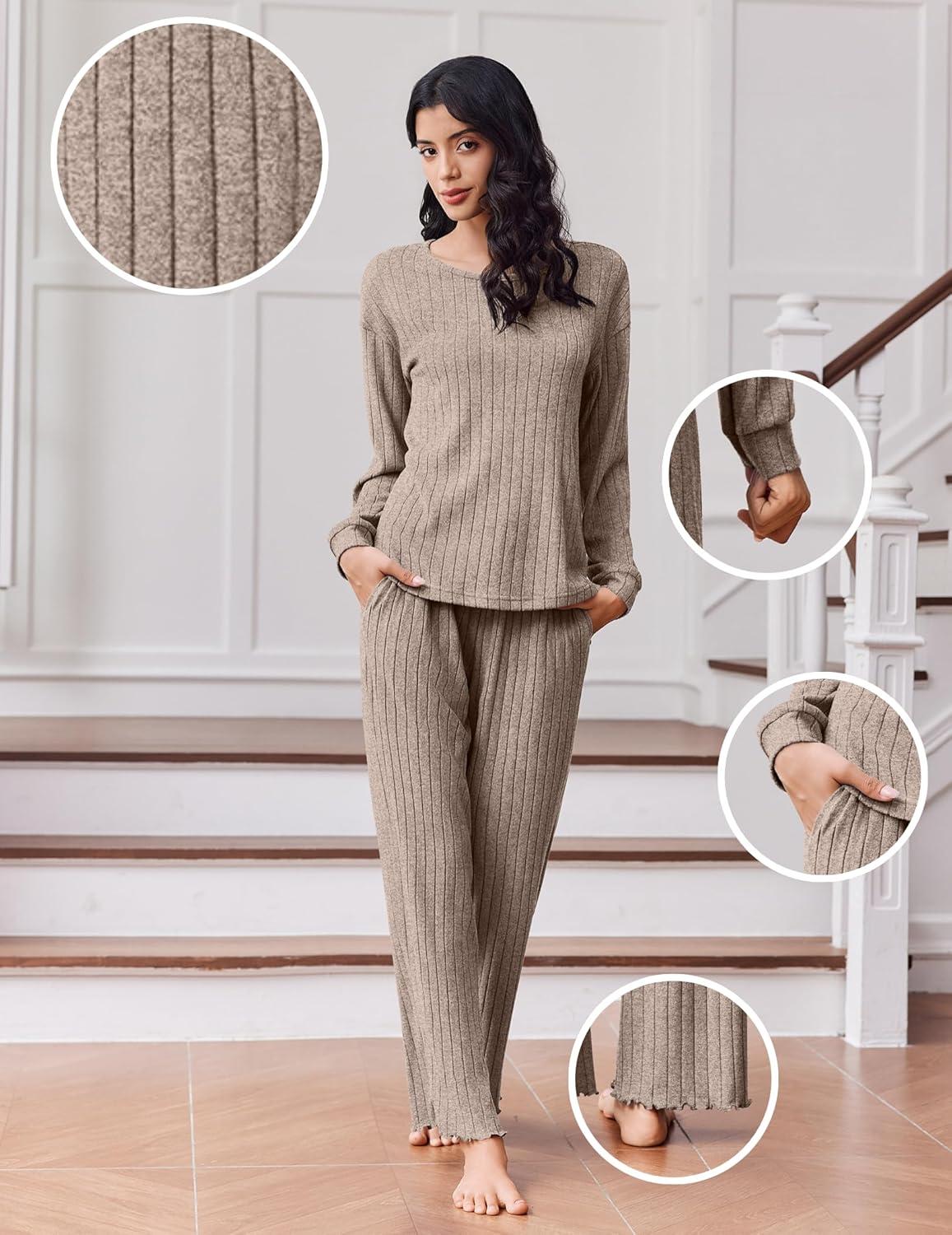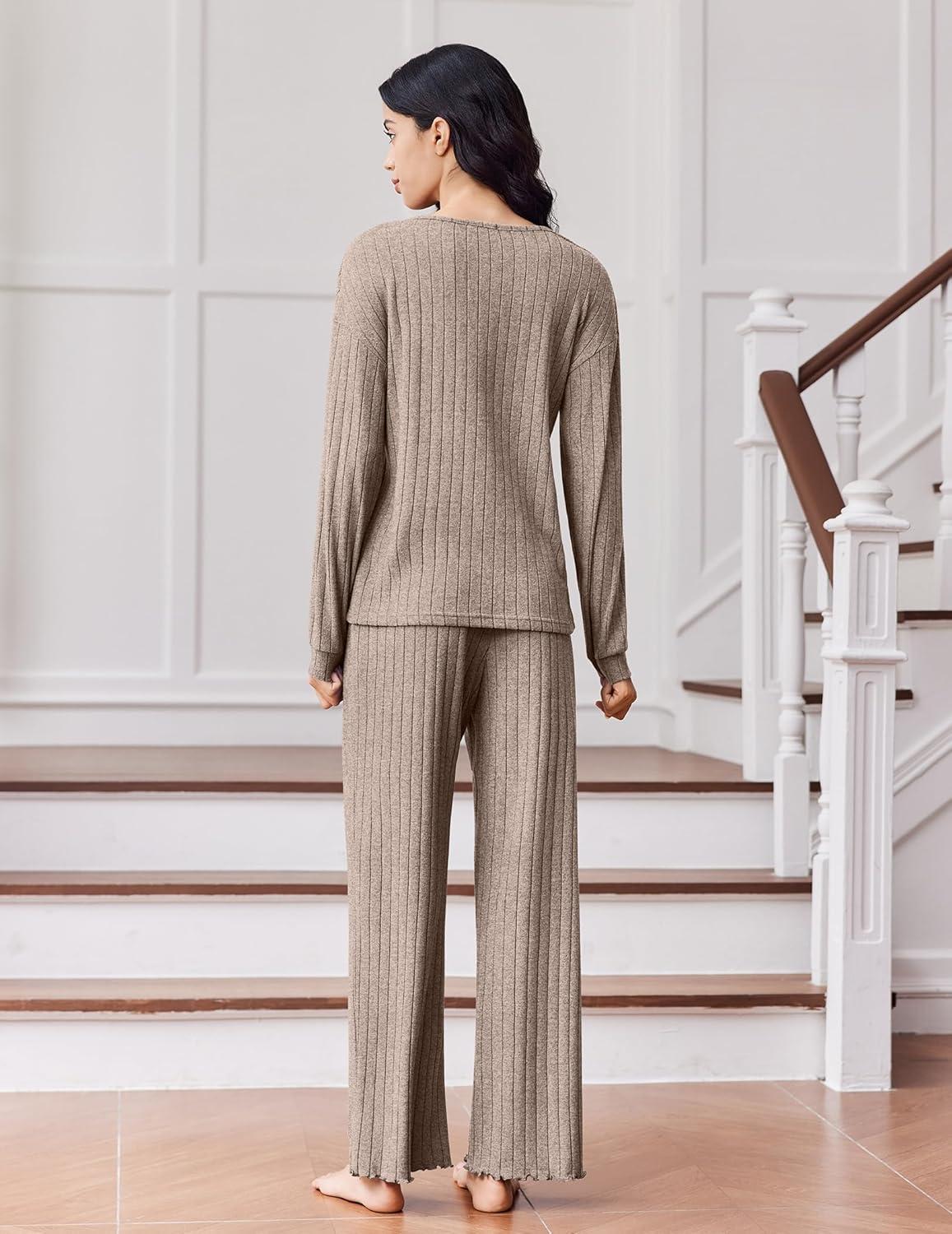 Ekouaer Lounge Sets for Women Comfy Ribbed Knit Pajamas Fall Long Sleeve Sleepwear 2 Piece Casual Loungewear,S-XXL(Tea Grey)