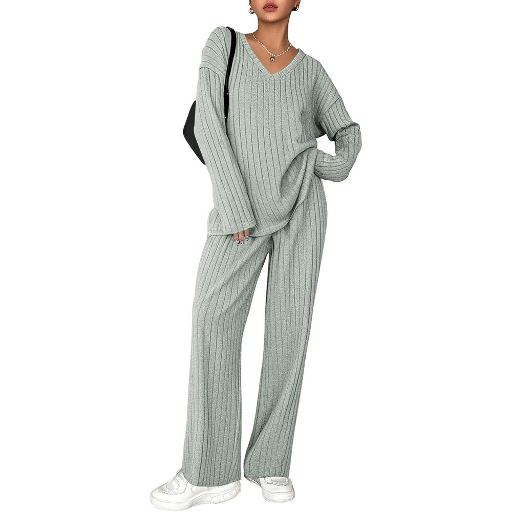 Ekouaer Lounge Sets for Women Long Sleeve Knit Ribbed Pajama Sets 2 Piece Casual Loungewear with Pockets(Light Gray)