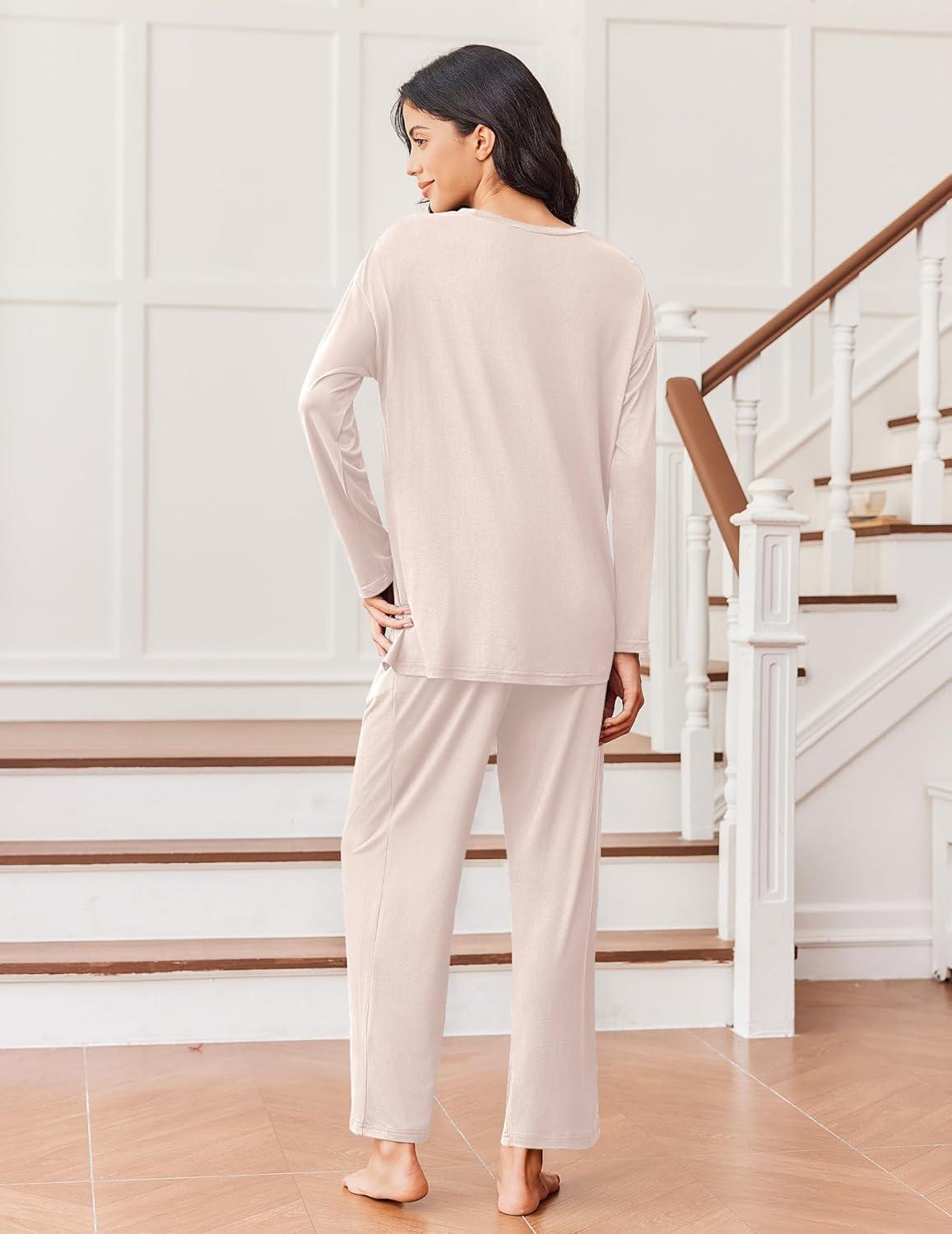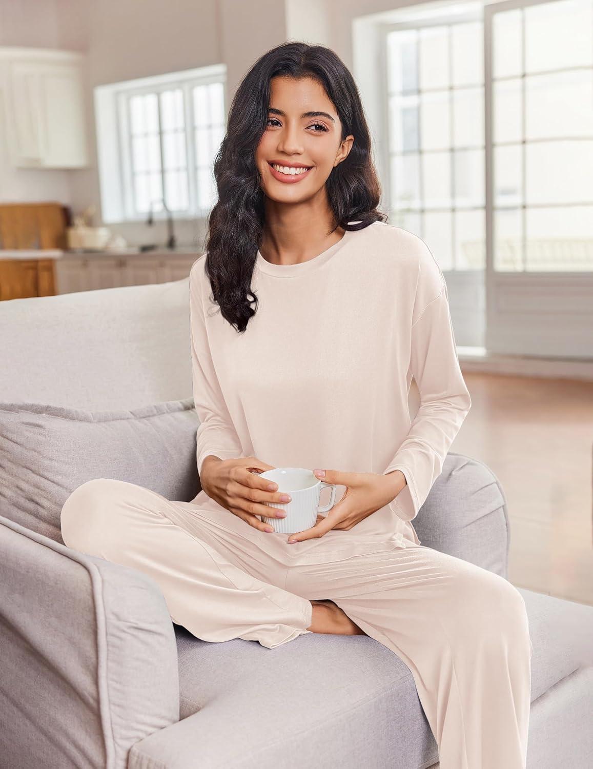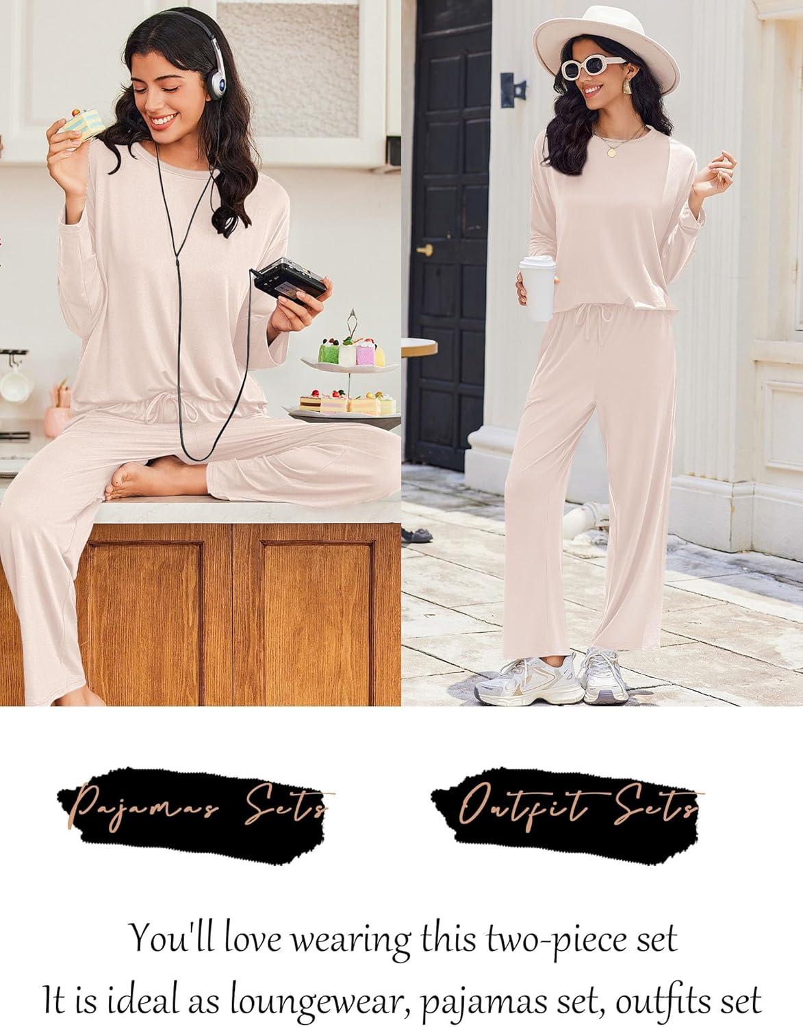 Ekouaer Lounge Sets for Women Long Sleeve Pajamas Fall Loungewear Soft Comfy Pjs Two Piece Travel Outfits Set(Beige)