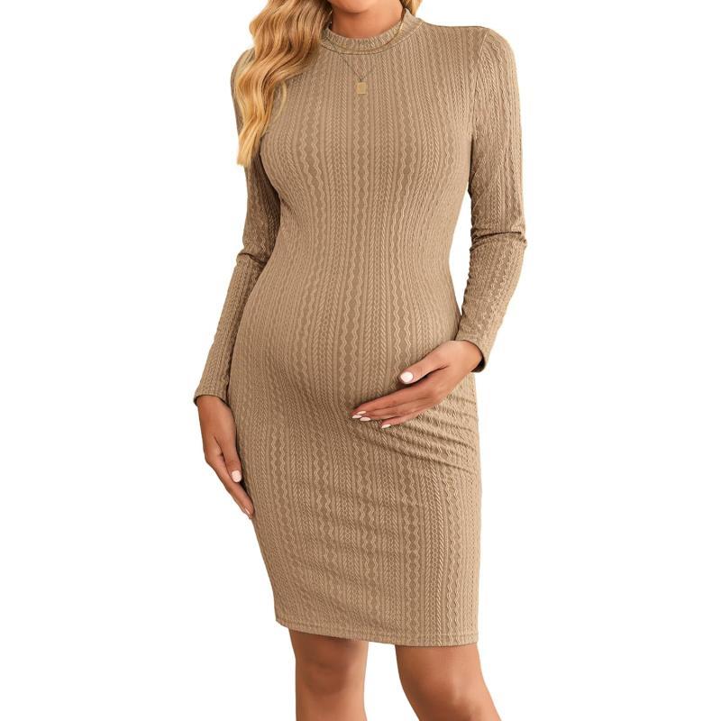 Ekouaer Maternity Dress Rib Knit Mock Turtleneck Long Sleeve Stretchy Bodycon Pregnancy Dresses(Khaki)