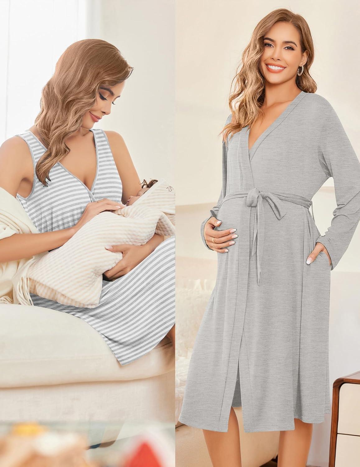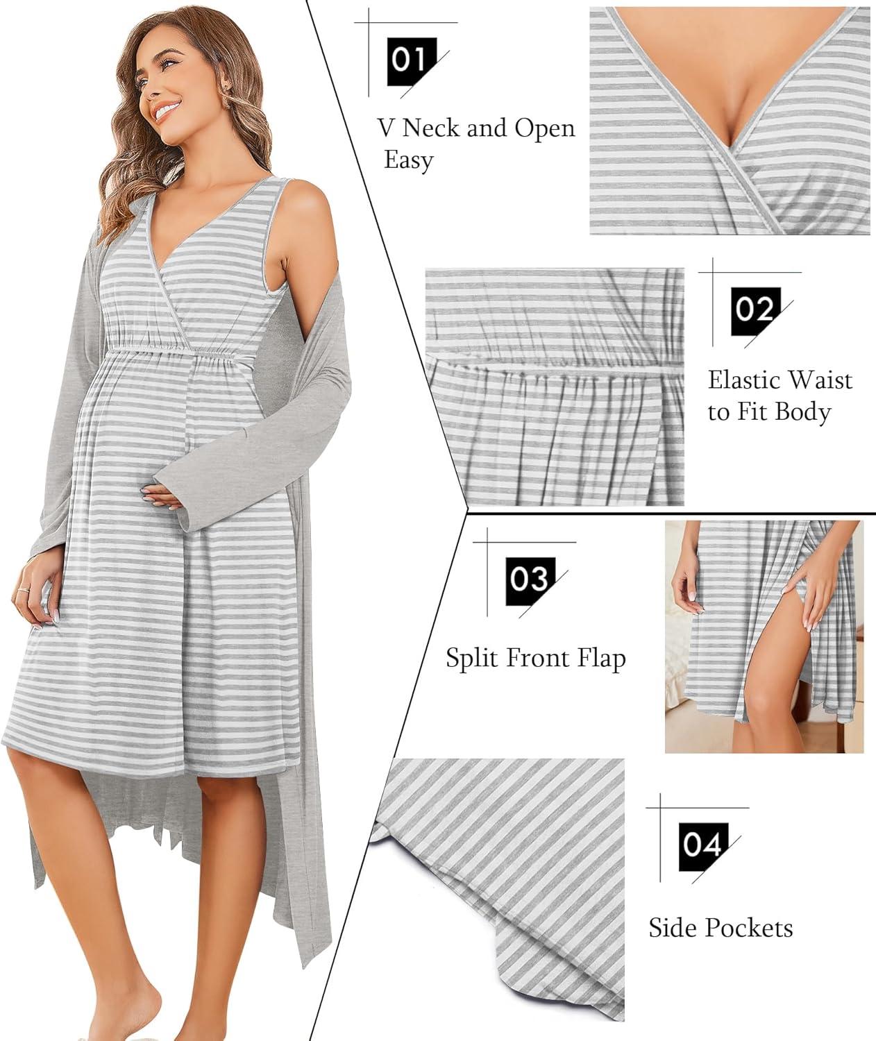 Ekouaer Maternity Nursing Gown and Robe Set Labor Delivery Nursing Nightgowns for Breastfeeding Pregnancy Clothes(Light Grey Stripe)