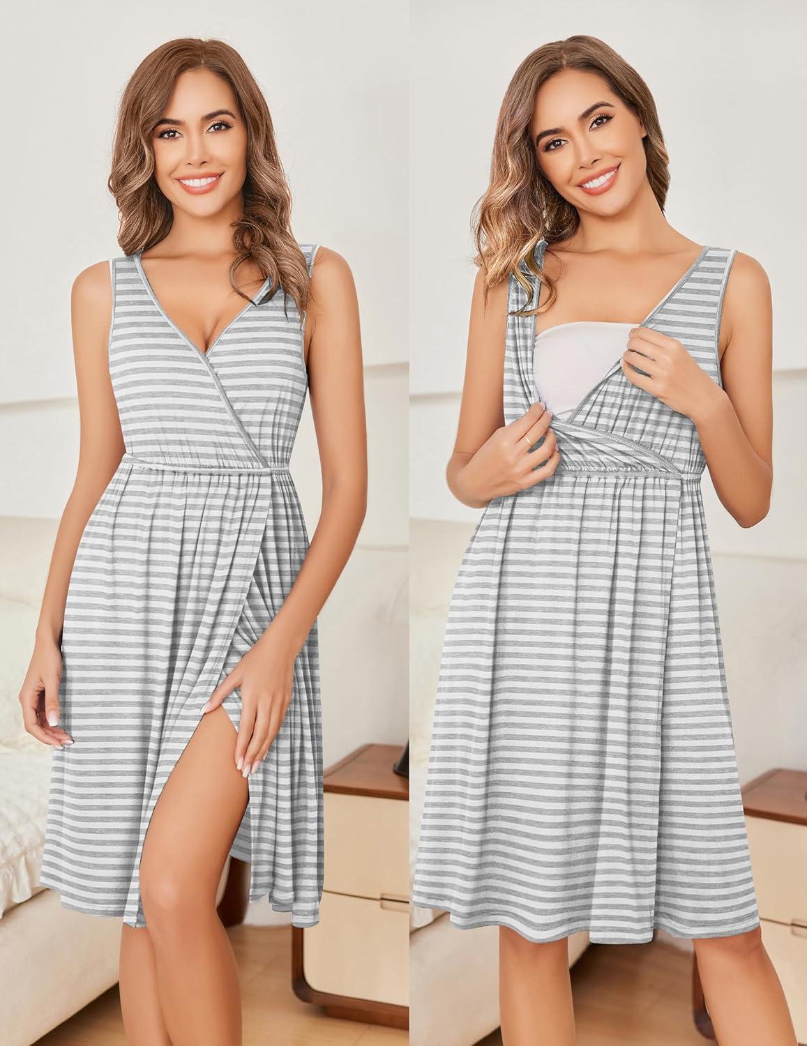 imageEkouaer Maternity Nursing Gown and Robe Set Labor Delivery Nursing Nightgowns for Breastfeeding Pregnancy ClothesLight Grey Stripe